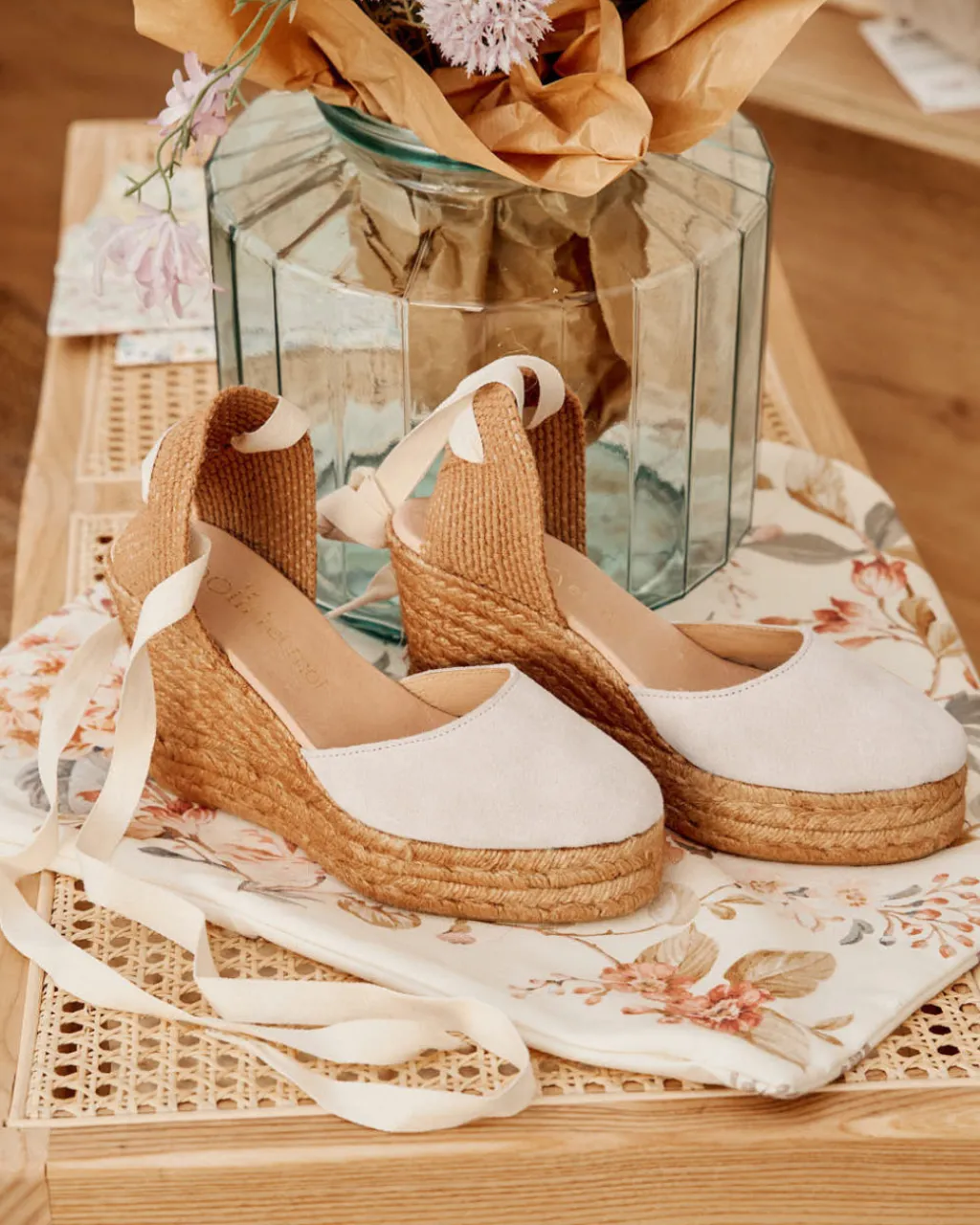 Alpargata de plataforma en serraje de color crudo. Sujeción al tobillo cintas en color blanco. Escote abierto redondo. Talonera cosida con hilo y esparto. Fabricación española de yute natural. La plantilla tiene una almohadilla para mayor comodidad. Una alpargata perfecta para todo el día e ideal para combinar con tus looks de primavera y verano favoritos. Diseñado y fabricado en España.
