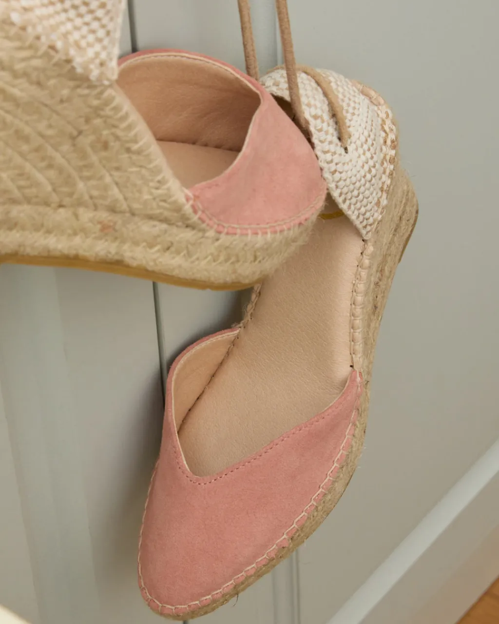 Alpargata de cuña en serraje de color rosa. Puntera ligeramente en punta. Sujeción al tobillo con cordones de algodón en color lino. Escote abierto en forma de corazón. Talonera cosida con hilo y esparto. Fabricación española de yute natural. La plantilla tiene una almohadilla para mayor comodidad. Una alpargata perfecta con un toque especial para esta temporada. Diseñado y fabricado en España.