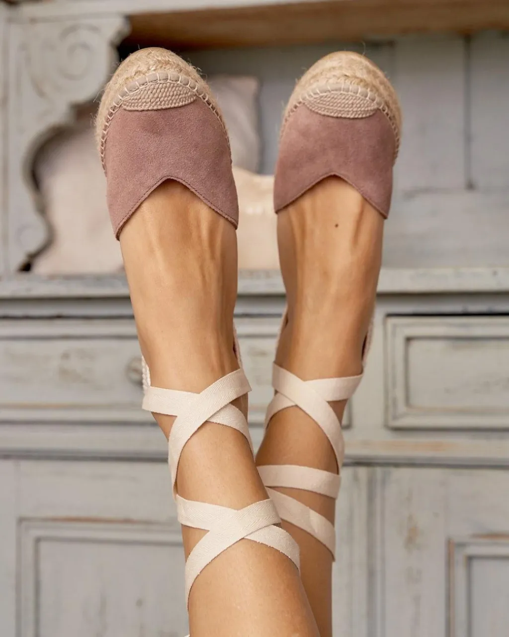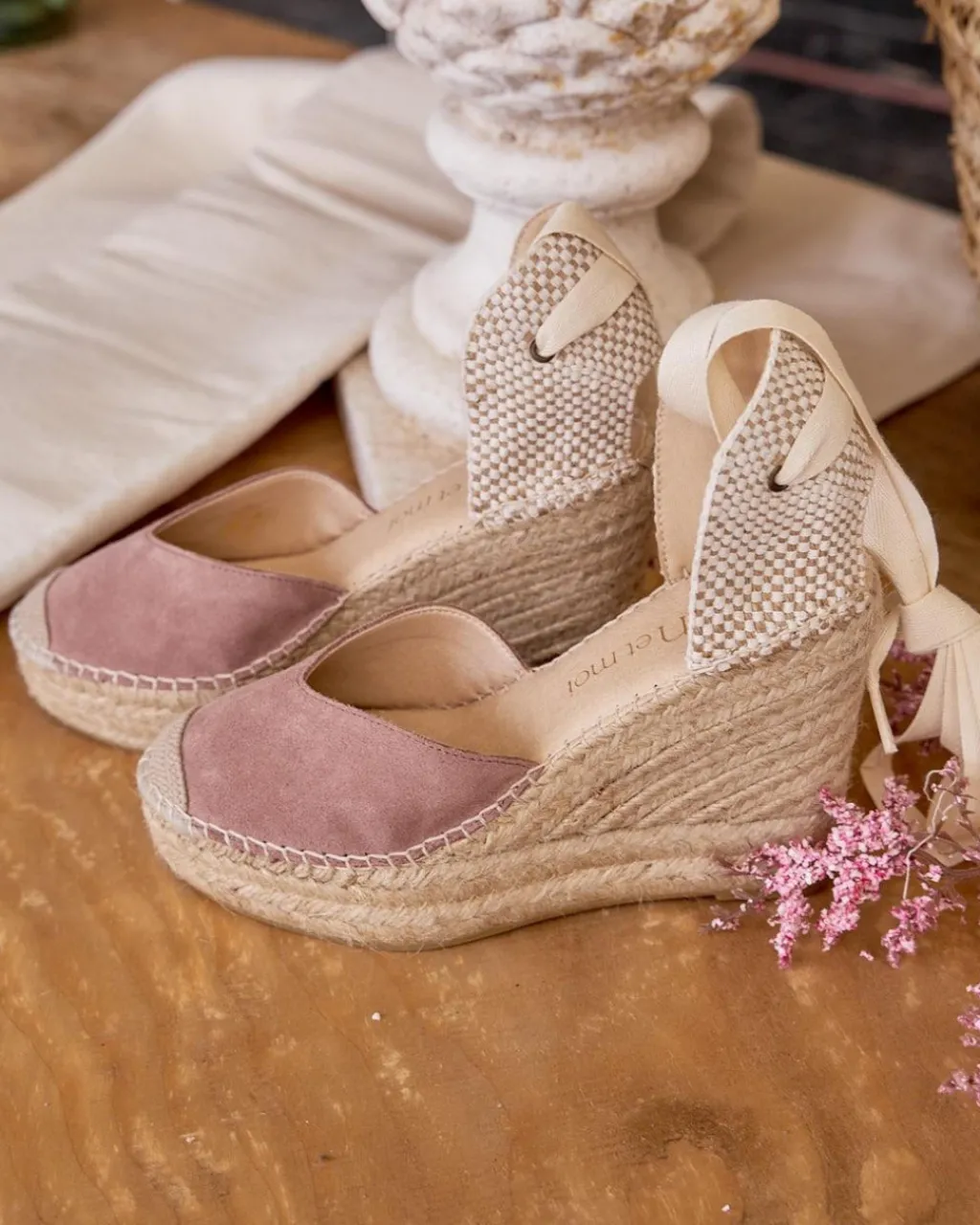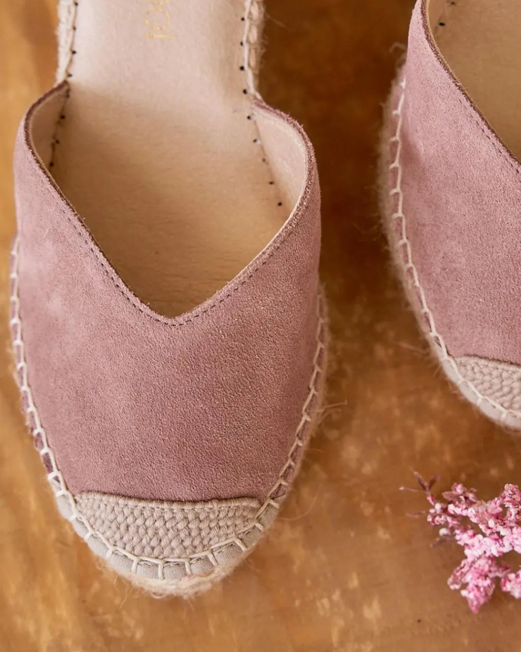 Alpargata de plataforma en ante de color malva. Sujeción al tobillo cintas en color crudo. Escote abierto en forma de corazón. Fabricación española de yute natural. La plantilla tiene una almohadilla para mayor comodidad. Una alpargata estilosa y femenina para el día a día. Diseñado y fabricado en España.