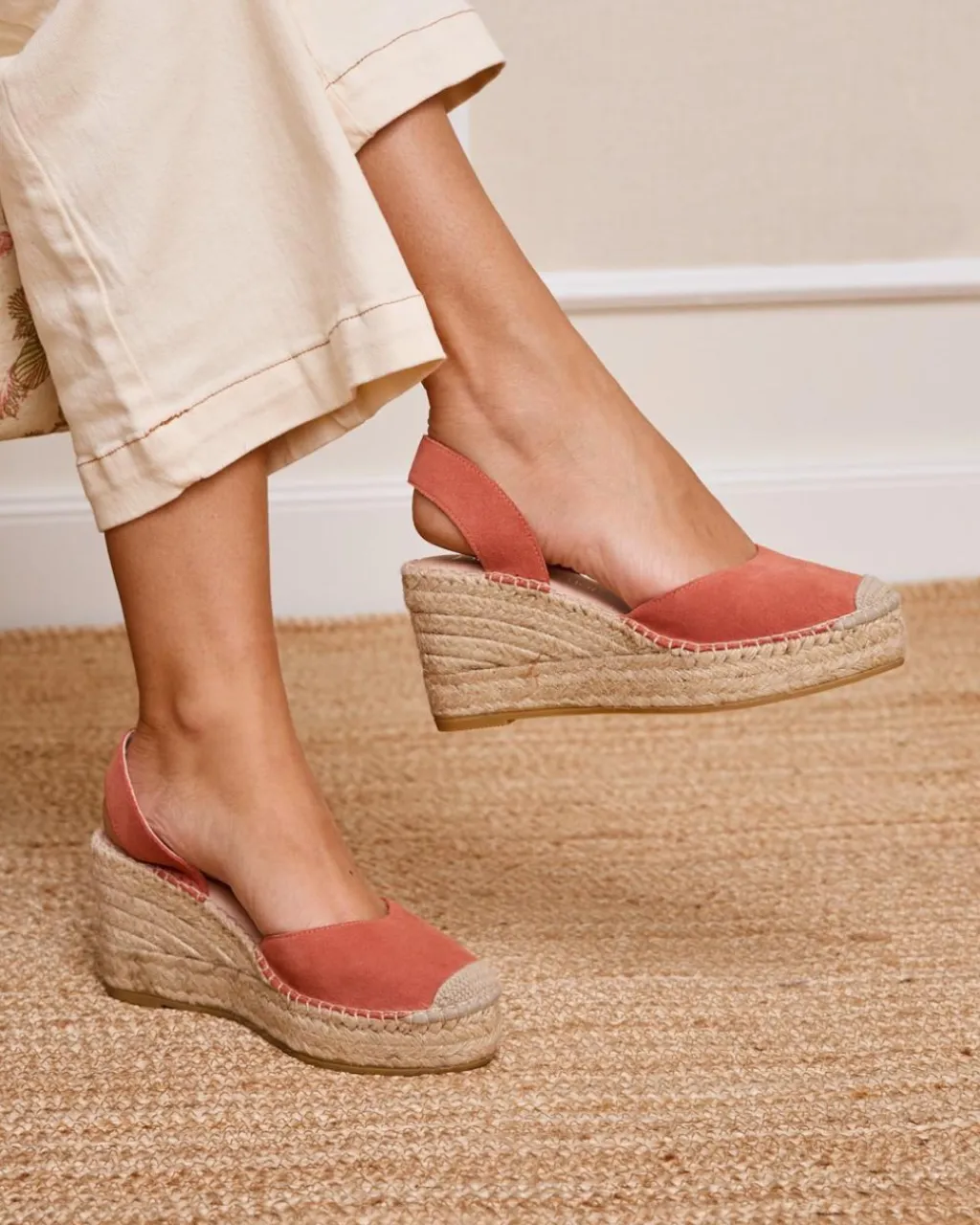 Alpargata alta destalonada en color mango. Puntera redondeada con la punta de esparto. Escote redondeado. Cierre en el talón con una tira ancha. Cuña de esparto. Un zapato muy femenino y cómodo para crear looks.