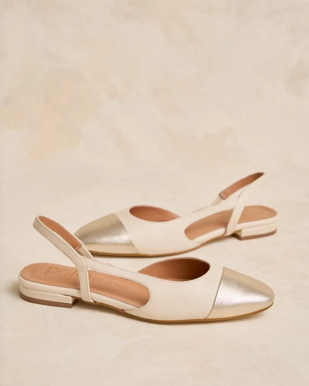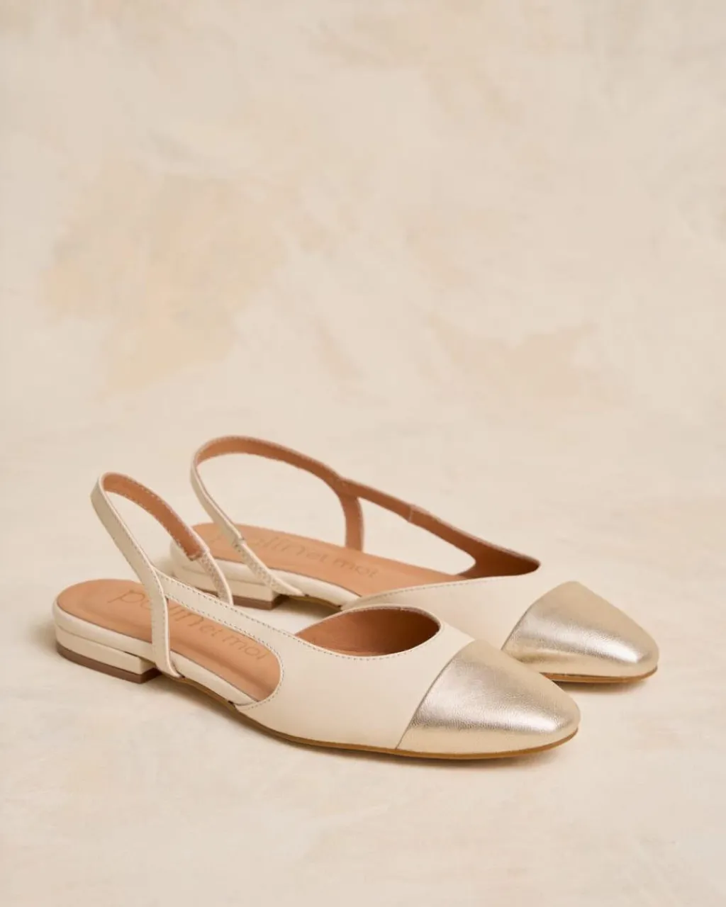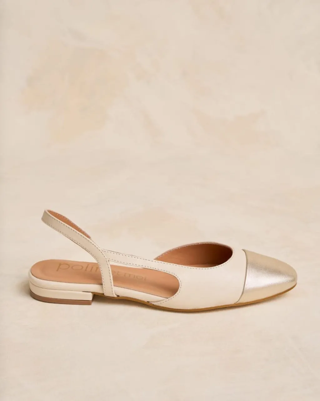 Bailarina de piel destalonada bicolor en tonos crudo. Puntera ligeramente puntiaguda en piel dorada. Correa al talón. Es un calzado diferente y cómodo para combinarlo tanto con pantalones como con vestidos.