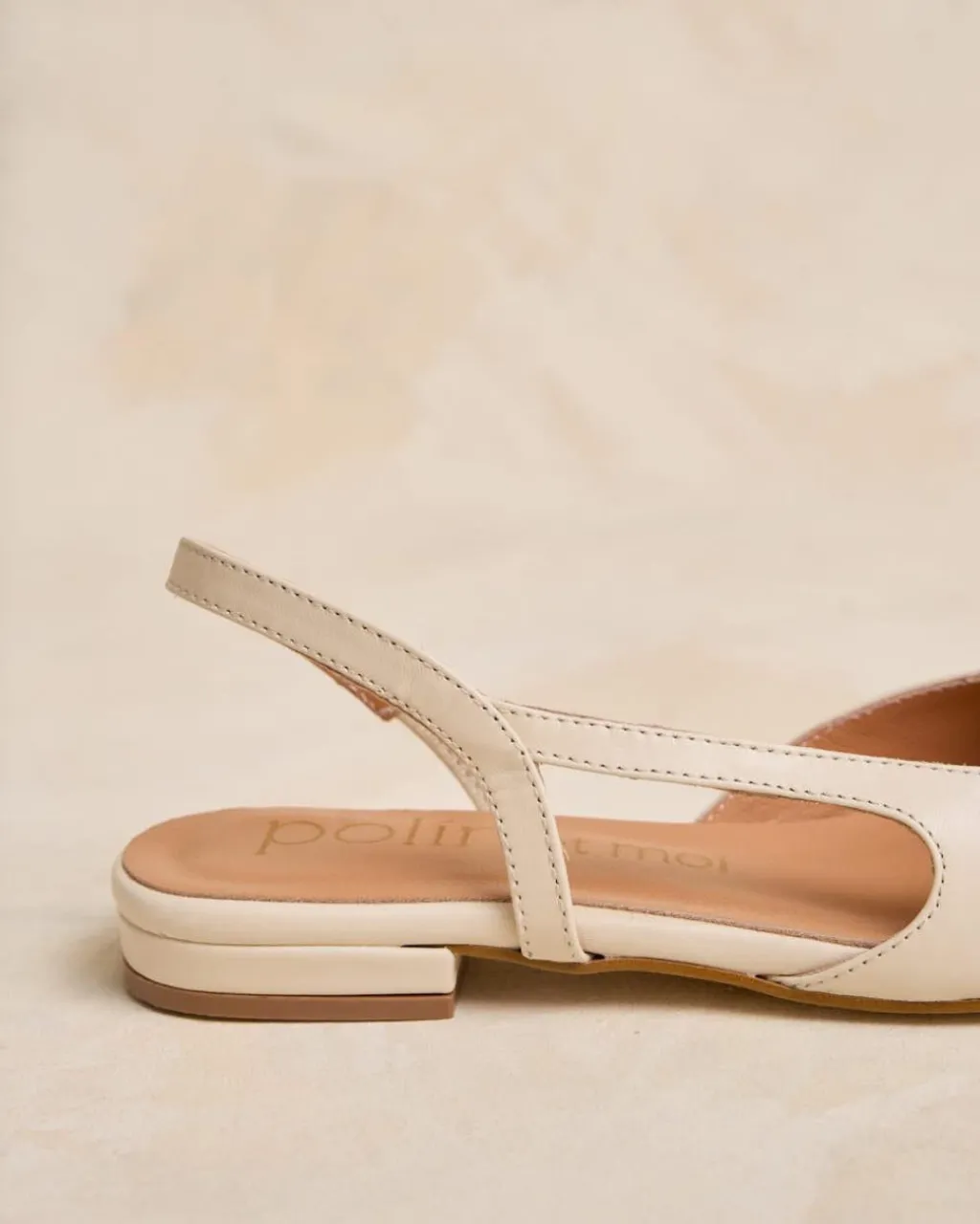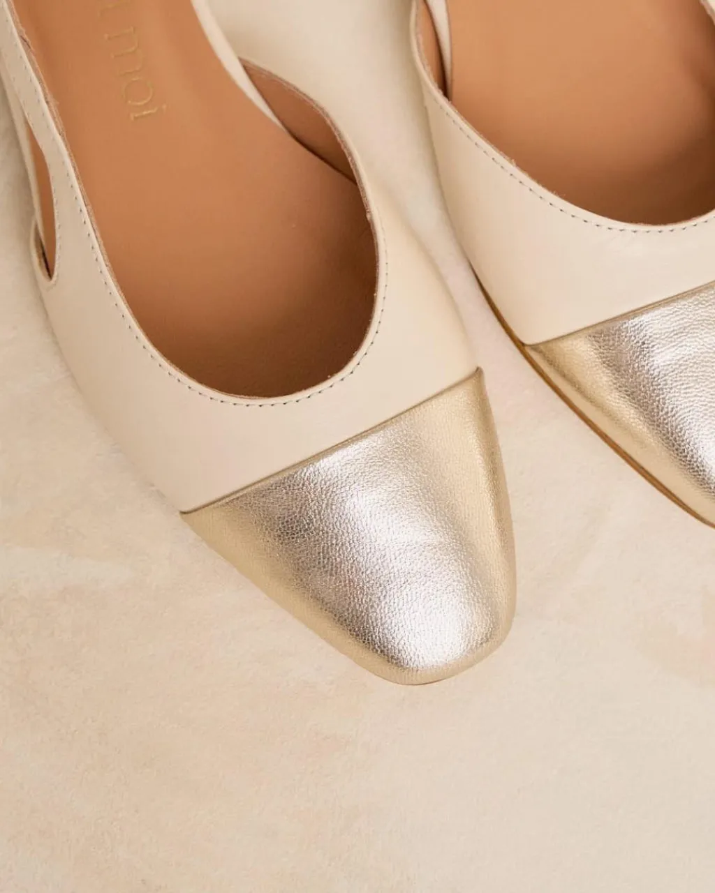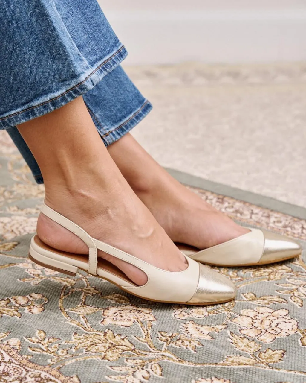 Bailarina de piel destalonada bicolor en tonos crudo. Puntera ligeramente puntiaguda en piel dorada. Correa al talón. Es un calzado diferente y cómodo para combinarlo tanto con pantalones como con vestidos.