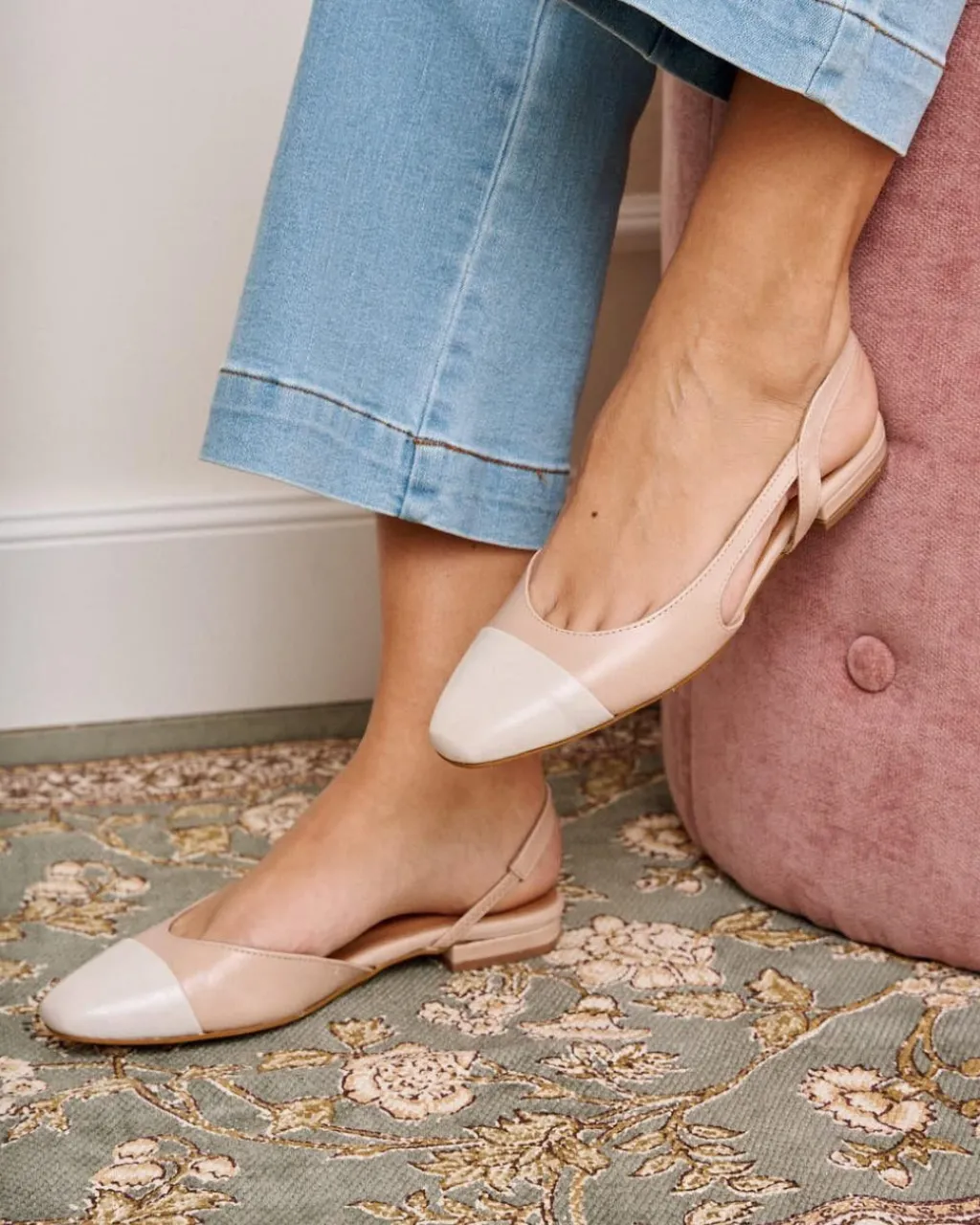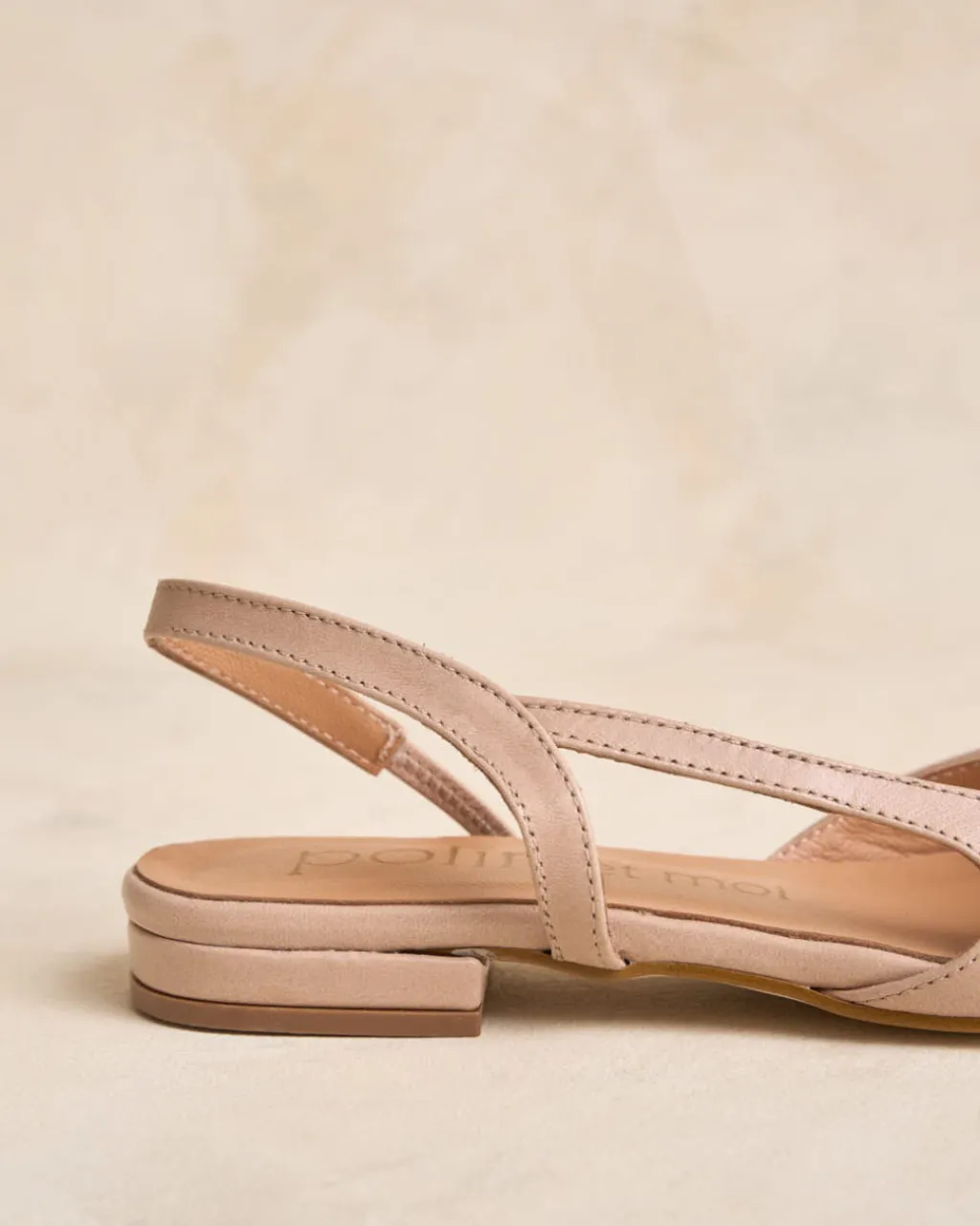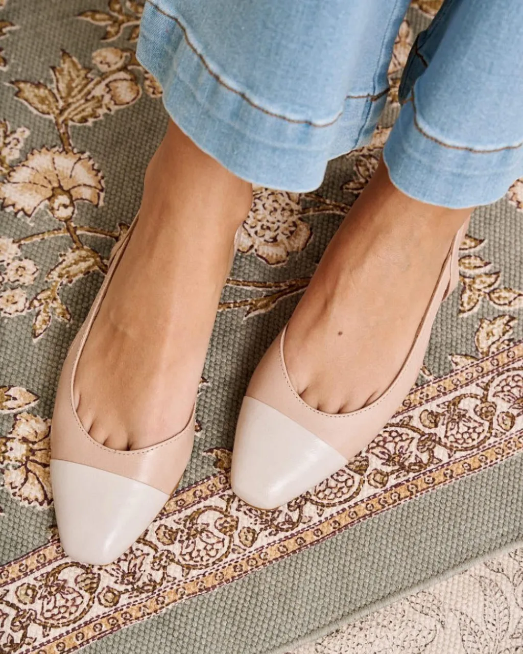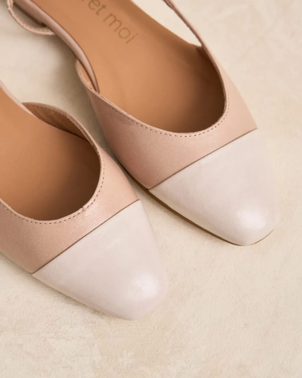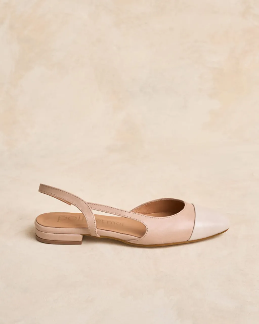 Bailarina de piel destalonada bicolor en tonos nude. Puntera ligeramente puntiaguda en piel crudo. Correa al talón. Es un calzado diferente y cómodo para combinarlo tanto con pantalones como con vestidos.