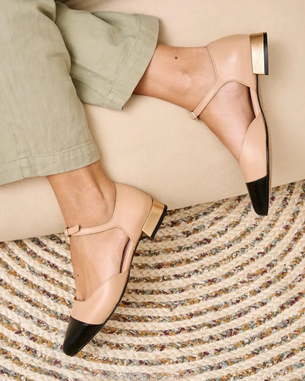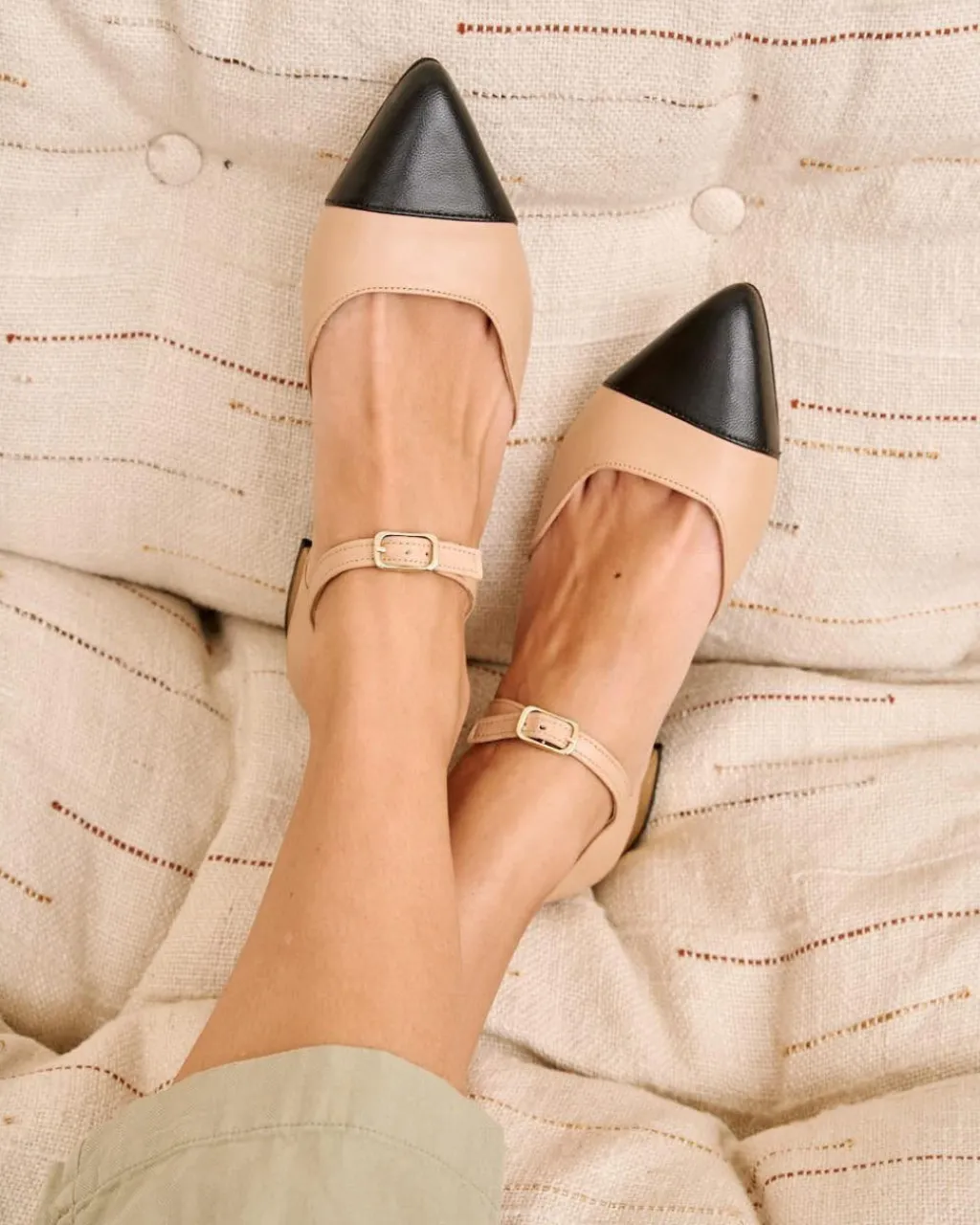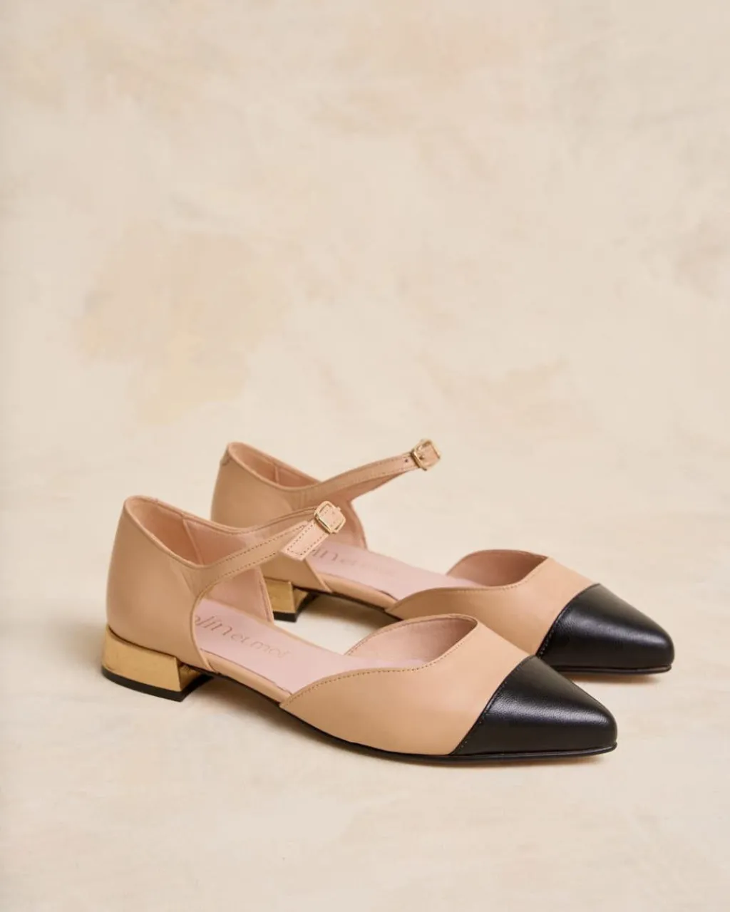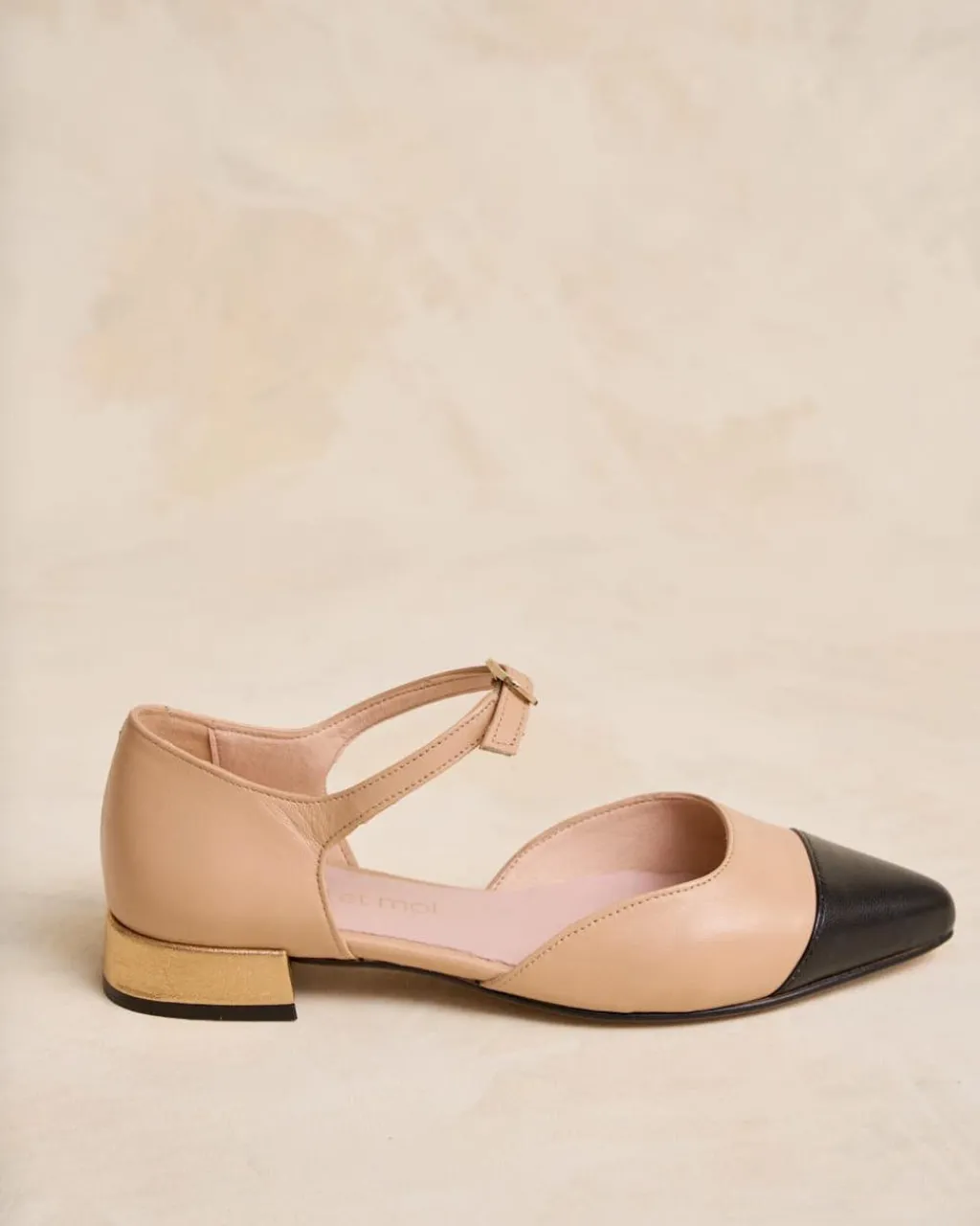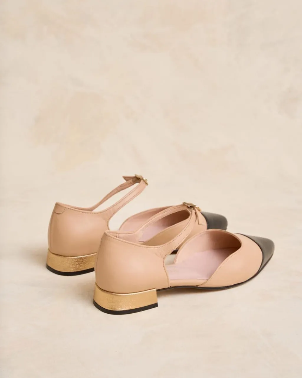 Bailarina de piel en color nude. Puntera puntiaguda en color negro. Correa con hebilla al tobillo. Pequeño detalle de tacón cuadrado en piel tono dorado. Es un calzado diferente y cómodo para combinarlo tanto con pantalones como con vestidos.