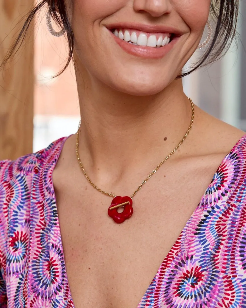 Colgante en tono dorado con detalle de una flor de tamaño mediano en color coral. Flor con volumen y un agujero central, ya que este detalle sirve, a su vez, de cierre. Colgante muy ligero y animado. Un colgante ideal para darle un toque de alegre y diferente a tus looks del día a día.