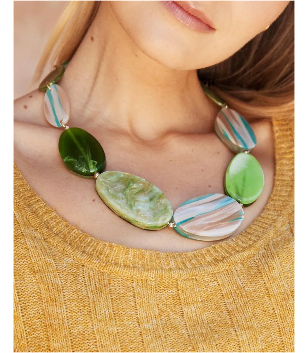 Collar largo con grandes abalorios en color verde.