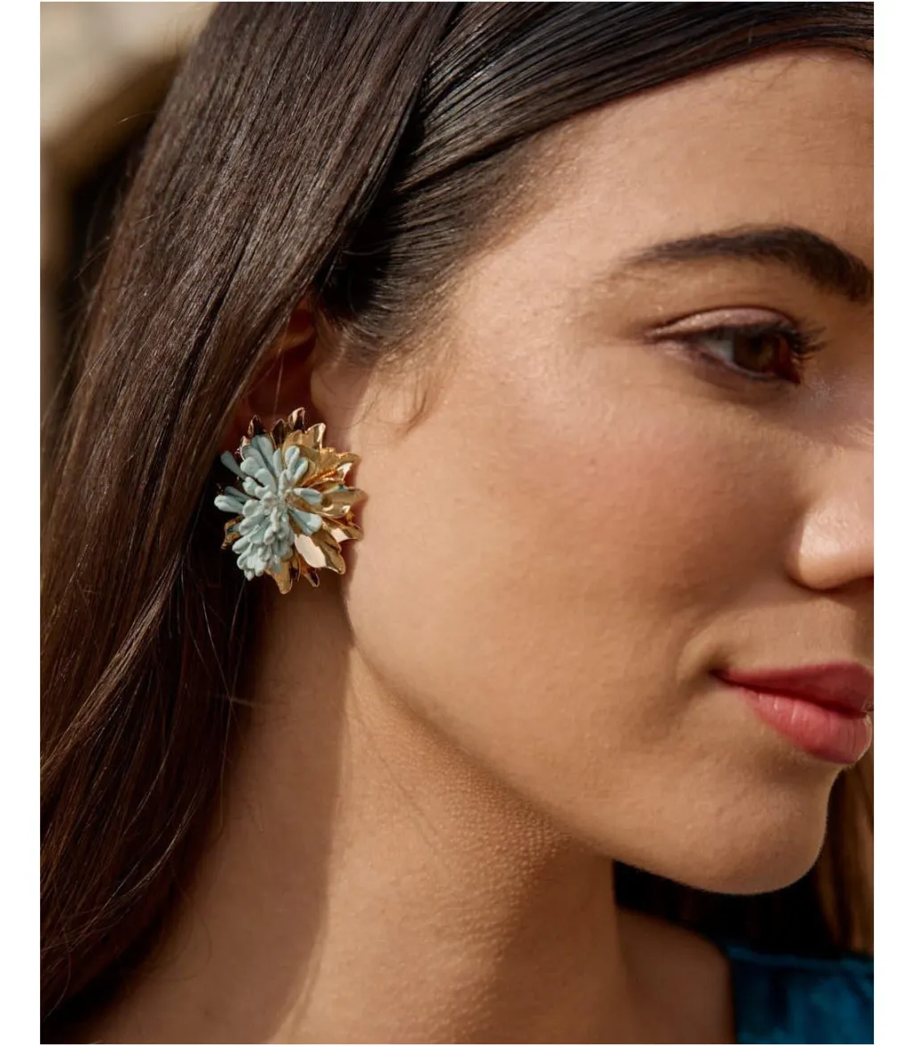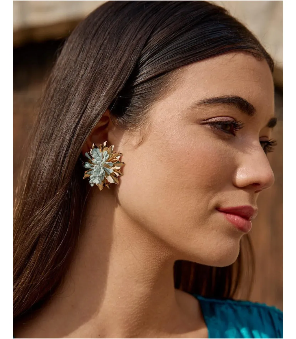 Pendientes pegados con detalle de una flor con volumen en un tono menta sobre flor en tono dorado. Pendientes muy ligeros. Cierre mediante tuerca. Un pendiente ideal para darle un toque diferente a tu look.