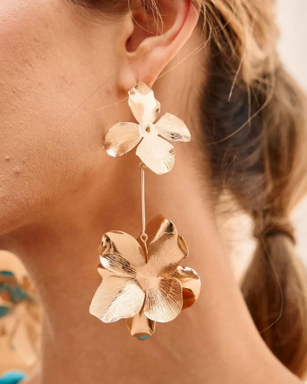 Pendientes largos con dos flores en relieve, en dorado. Una flor en la parte que pega al lóbulo y otra colgando más abajo. Pendientes con diseño alargado, rígido y muy ligeros. Cierre mediante tuerca. Un pendiente ideal para darle un toque diferente a tu look.