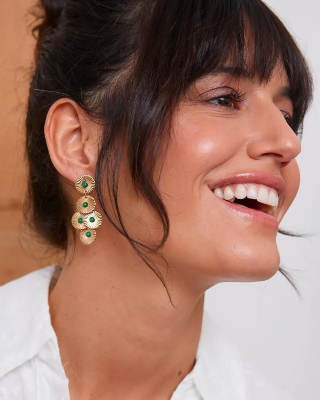 Pendientes largos de círculos con detalles de piedras verdes. Son muy ligeros. Cierre mediante tuerca. Un pendiente ideal para darle un toque diferente a tu look.