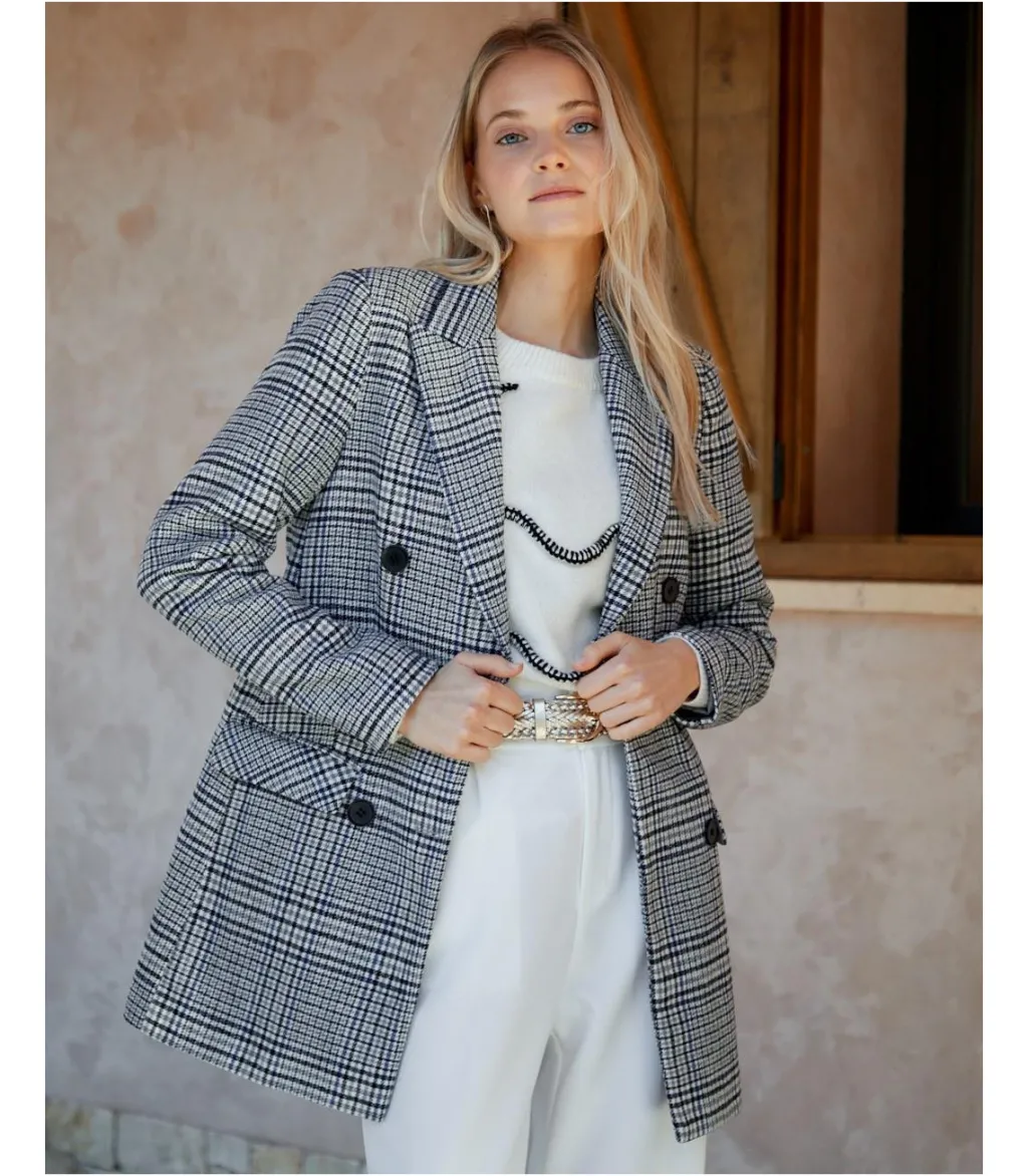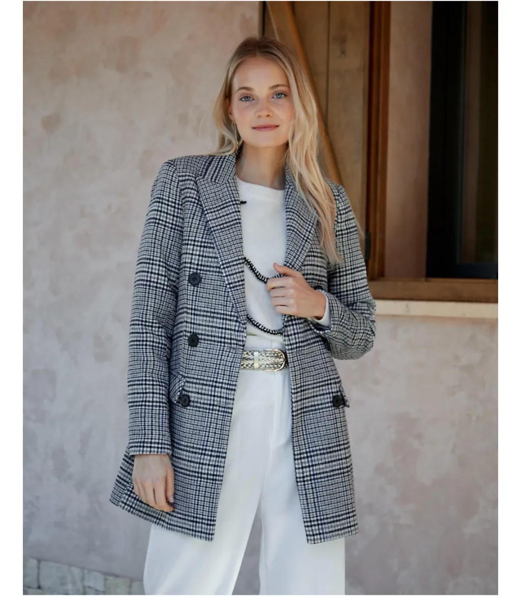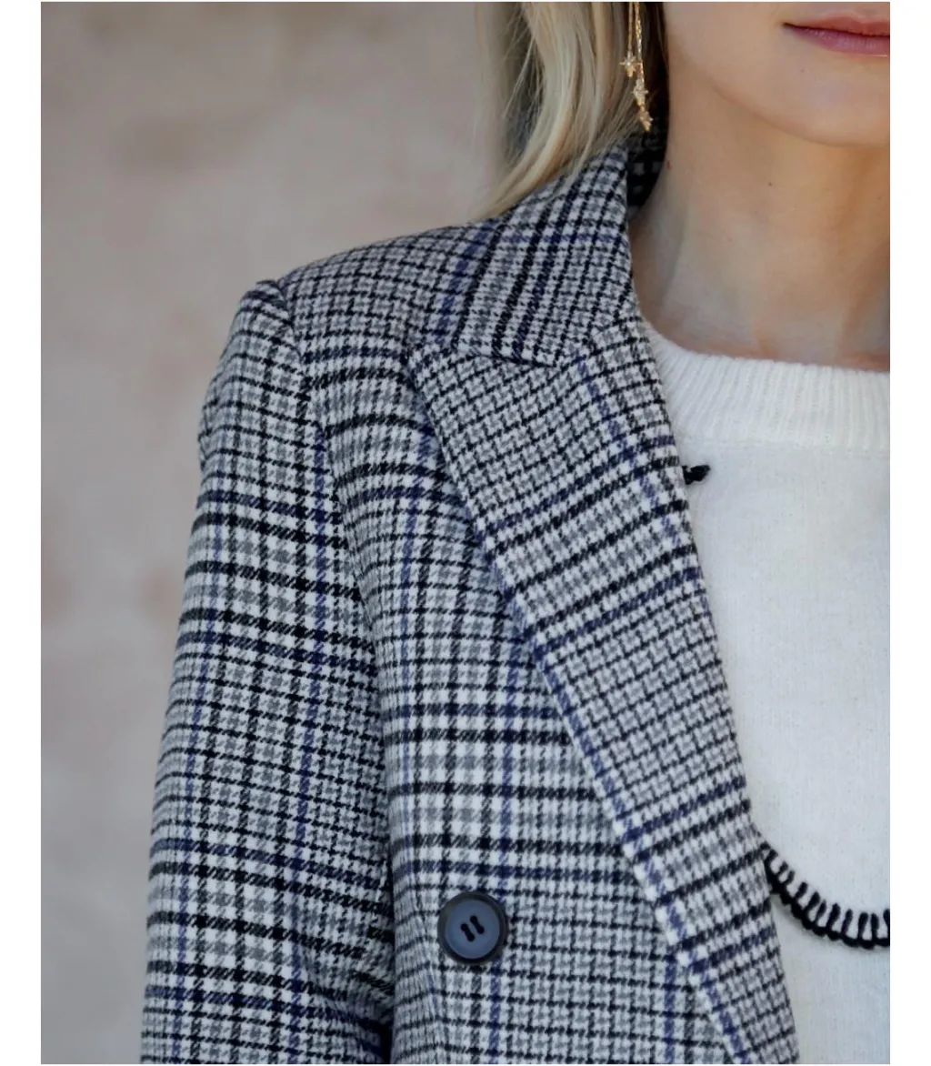 Abrigo de cuadros en color tonos denim. Cuello con solapa. Detalle de bolsillos con solapa en los laterales. Diseño de doble botonadura. Manga larga. Diseño de cuerpo recto. Forro interior. Apertura en el bajo trasero para mayor comodidad.