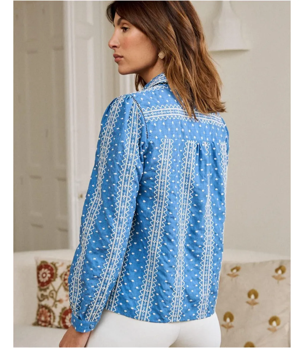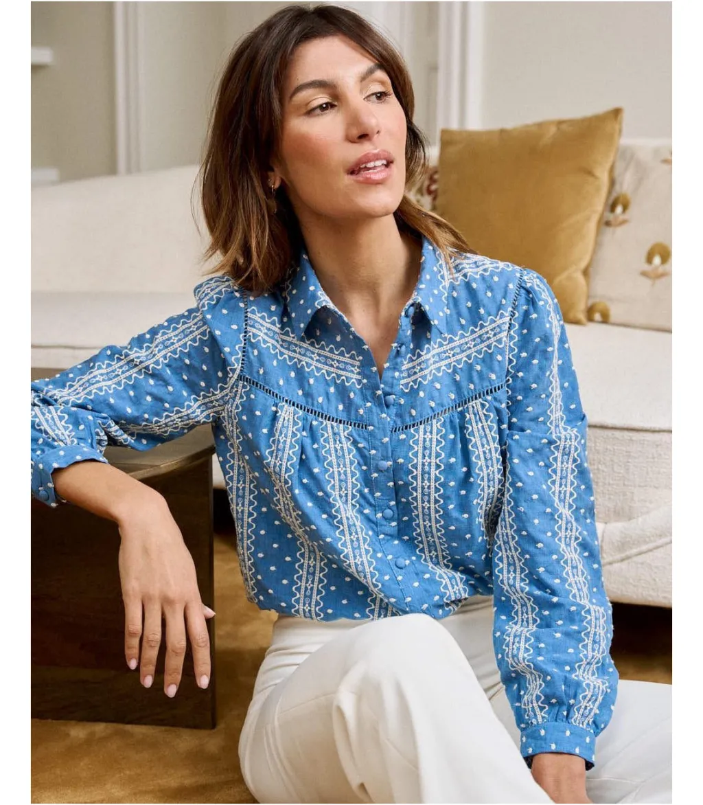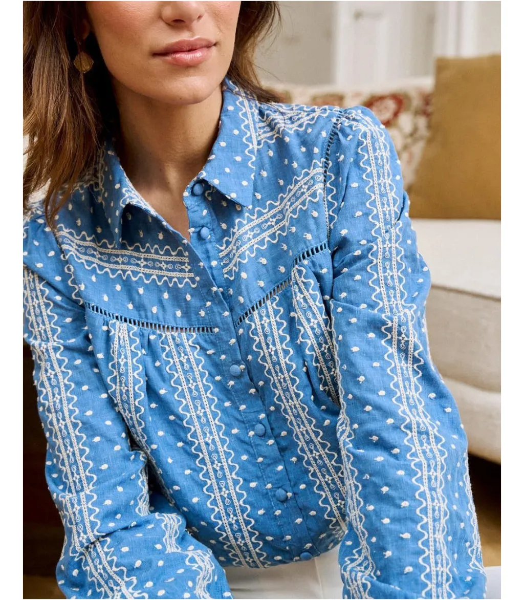 Blusa con estampado bordado en color crudo sobre un fondo azul marino. Cuello de camisa. Modelo de manga larga terminada en puño. Cuerpo recto y ligeramente holgado. Hilera de botones desde el cuello hasta el bajo. Camisa en un tejido vaquero con un toque elegante y alegre.