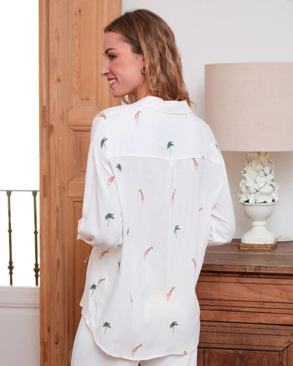 Camisa con estampado de jirafas y palmeras sobre un fondo blanco. Cuello de camisa. Modelo de manga larga recta y terminada en puño. Cuerpo recto y un bolsillo en la parte superior izquierda. Hilera de botones desde el cuello hasta el bajo. Camisa con un toque diferente y alegre para el día a día. Ver másVer menos Referencia 180164 COMPOSICIÓN Y MEDIDAS:60% Algodón, 40% LinoSorima mide 1,80 cm y lleva la talla S. Si dudas con la talla te recomendamos usar el recomendador online.CUIDADOS:Lavar a mano máximo 30º Ficha técnica Colores BLANCOS Etiquetas: MUSY M21421 – ENVÍOS, CAMBIOS Y DEVOLUCIONES Favorito34 ENVÍOS:Todos los envíos cuentan con gastos de envío, que dependen de la dirección de entrega.• Península y Portugal: 3,50€ | 2-4 días laborables.• Baleares: 6,50€ | Hasta 7 días laborables.• Países de la Unión Europea: 10,95€ | Hasta 10 días laborables.• Envíos a Europa (No UE): 15,95€ | Hasta 10 días laborables.• Resto del mundo*: Aprox 10€ | Hasta 15 días laborables.*NO hacemos envíos a Canarias, Ceuta, Melilla, Afganistán, Bielorusia, Congo, Bali, Myanmar, Nigeria, Rusia, Senegal, Somalia y Ucrania.¡Importante! En periodo de rebajas, los pedidos pueden tardar un poco más de lo habitual ¡Rogamos paciencia!CAMBIOS: ¡El envío con el cambio solicitado es gratuito!Pedidos realizados desde España:Plazo de 14 días laborables desde que recibes el paquete en casa.Pedidos realizados desde fuera de España:Plazo de 20 días naturales desde que realizamos el envío.*La gestión del envío del paquete de vuelta a nuestro almacén corre a cuenta del cliente, haciéndose cargo de los costes de este envío, mediante el courier de su elección o con nuestro servicio de DHL.En el primer trámite de cambio, el envío de vuelta es gratuito (tanto de talla como de producto). Permitimos DOS trámites de cambio, en caso de querer tramitar un segundo cambio, se descontarán los gastos de envío según destino.Una vez recibido el paquete en nuestro almacén, tramitaremos tu cambio en un plazo máximo de hasta 10 días laborables. Recibirás un correo de confirmación cuando este pedido de cambio esté listo para ser enviado.