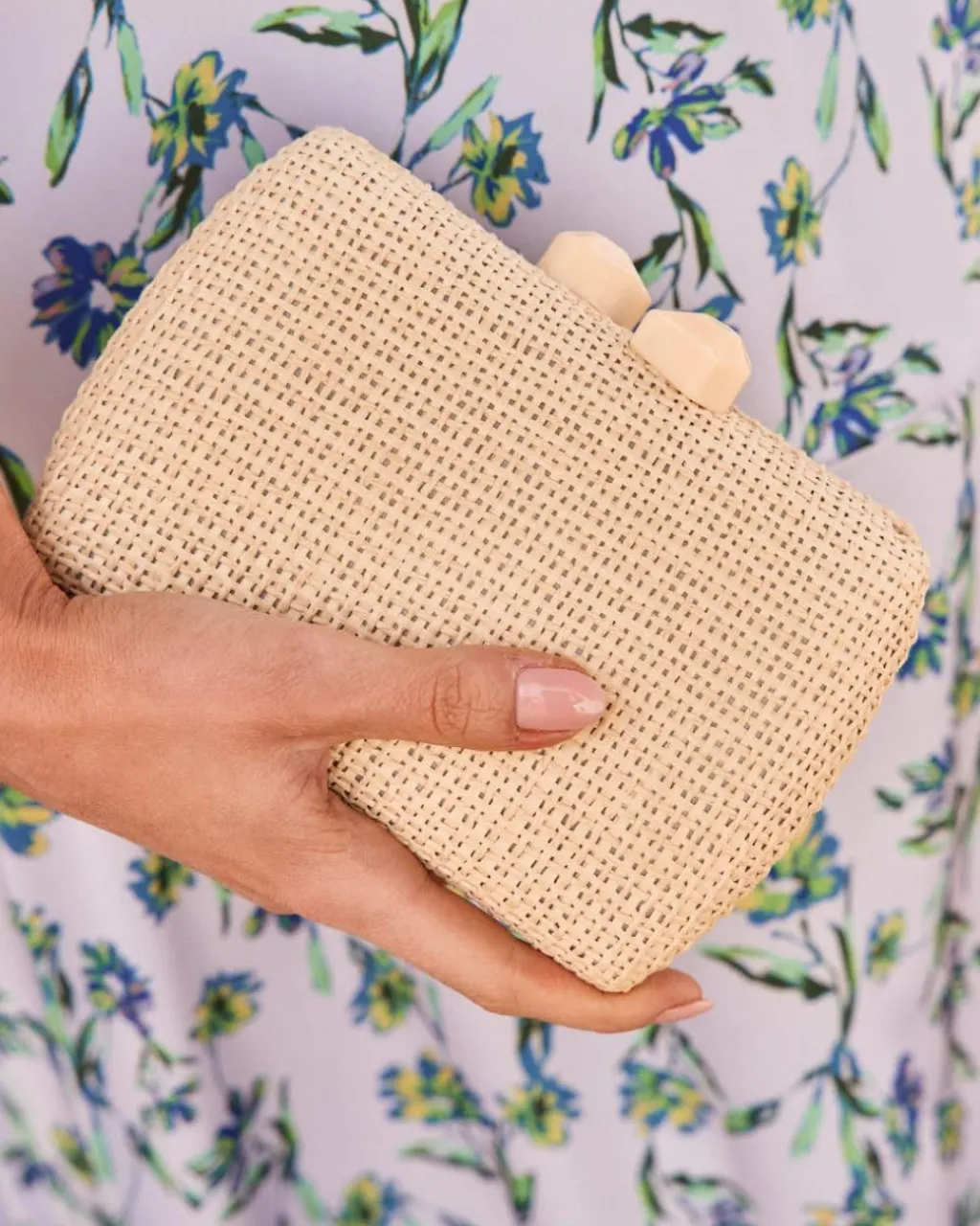 Clutch o bolso de mano de rafia en color beige. Bolso ligeramente rectangular y puntas redondeadas con broche central de nácar que permite cerrar y abrir el bolso con facilidad.