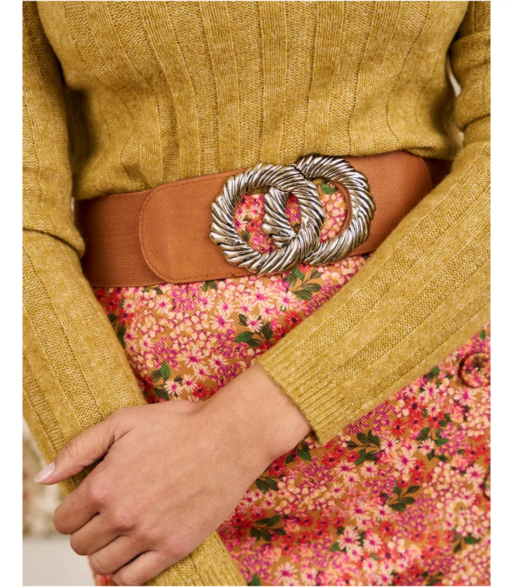 Cinturón elástico de ante en color cuero. Cierre central mediante dos hebillas redondas y metálica con detalles brocados. Ideal para darle un toque diferente a tus looks esta temporada.
