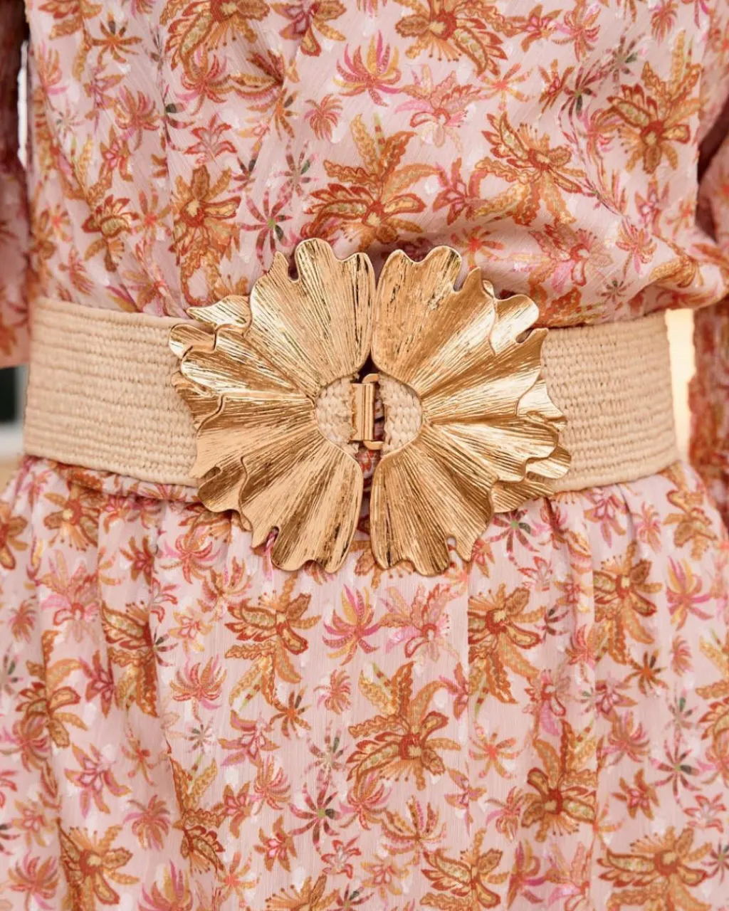 Cinturón ancho elástico de rafia en tono crudo, con detalle de flor grande en el centro en tono dorado. Accesorio ideal para completar tus looks.