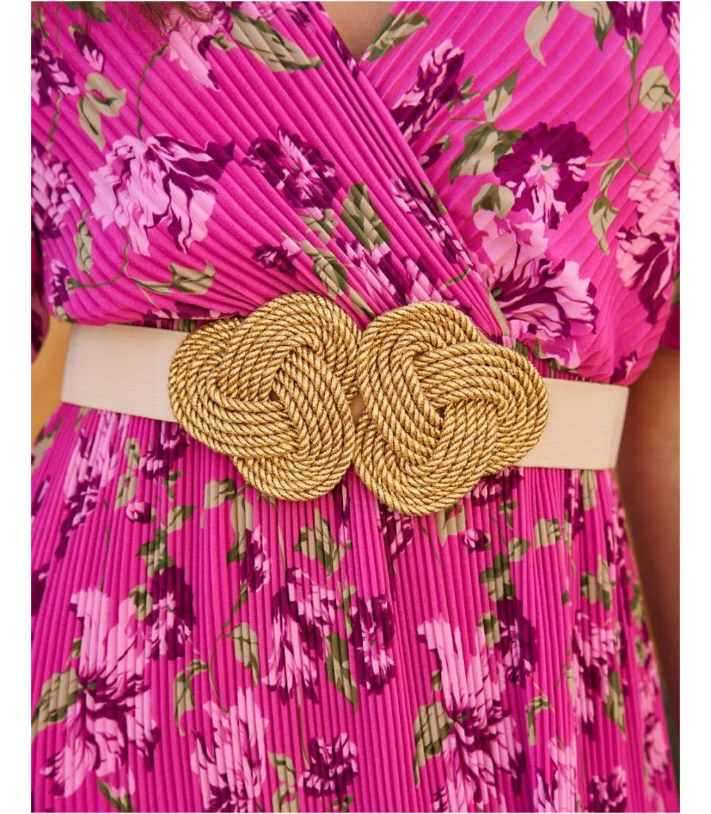 Cinturón elástico tono beige, con detalle en el centro de multiples tiras entrelazadas entre sí. Se abroocha por la parte trasera. Accesorio ideal para completar tus looks.