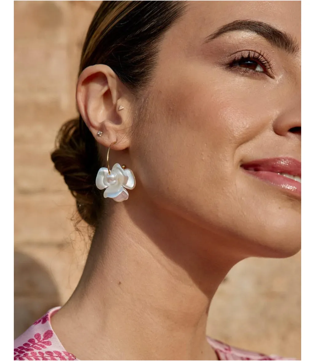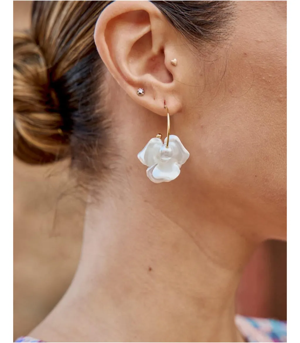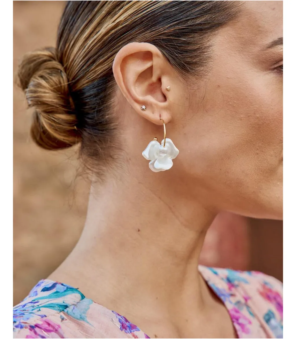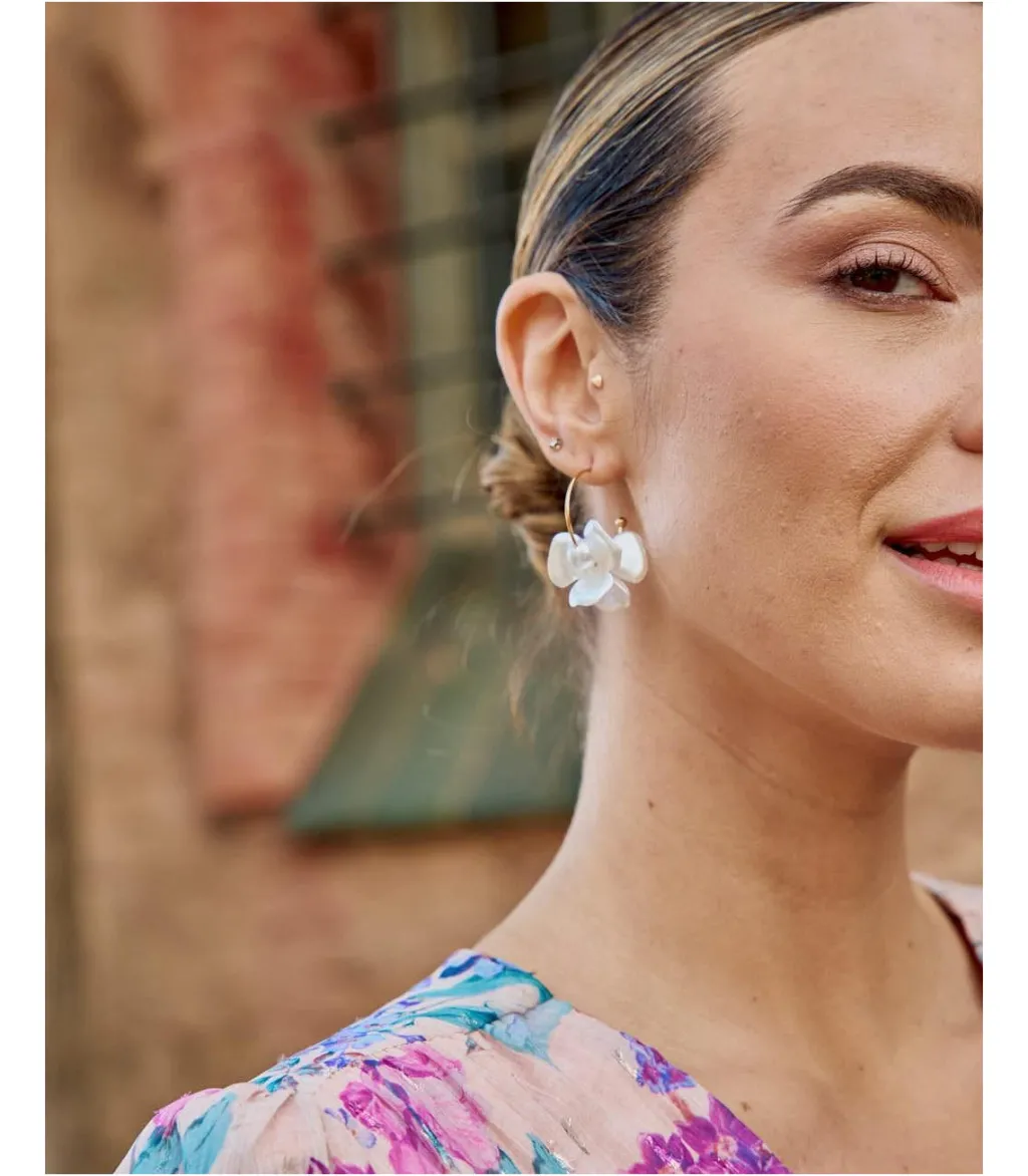 Pendientes largos que caen con una flor en relieve en tono perla. Modelo con cierre en la parte trasera de clic. Unos pendientes ligeros e ideales con los que dar un toque sofisticado a tus looks.