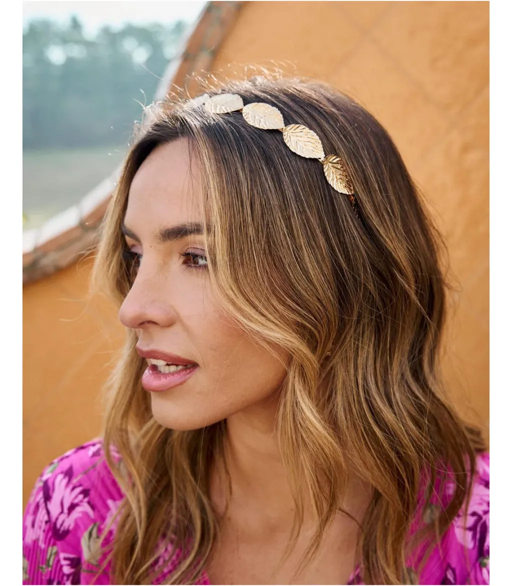 Diadema rígida, con múltiples hojas al rededor también rígidas. Tono dorado. Accesorio ideal para completar tus looks.