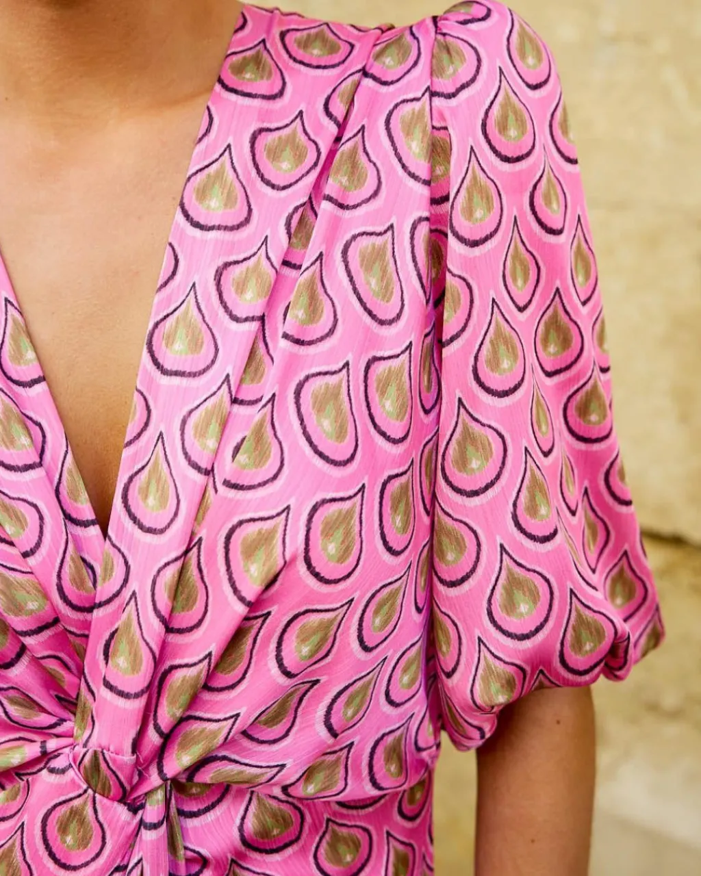 Vestido largo con estampado de lágrimas en color rosa. Escote en pico. Corte en la cintura. Detalle de fruncido debajo del pecho que baja hasta la falda. Manga corta y ligeramente abullonada terminada en elástico. Cierre de cremallera en la espalda. Flada con vuelo y con corte central. Tejido muy cómod y suave. Incluye forro interior. Vestido muy femenino y estiloso para deslumbrar en los eventos de la temporada.