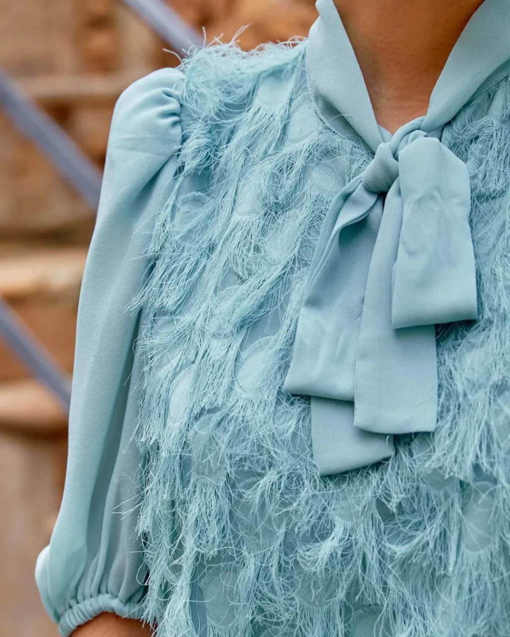 Vestido corto invitada con flecos y dibujos circulares en color turquesa. Escote cerrado con lazada en el cuello. Diseño de cuerpo recto. Manga corta abullonada con volumen en el hombro. Incluye forro interior. Vestido ideal también para la lactancia y el embarazo.