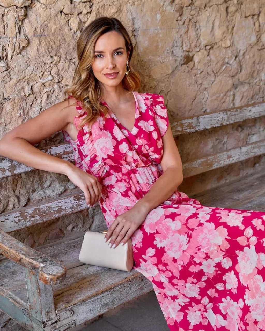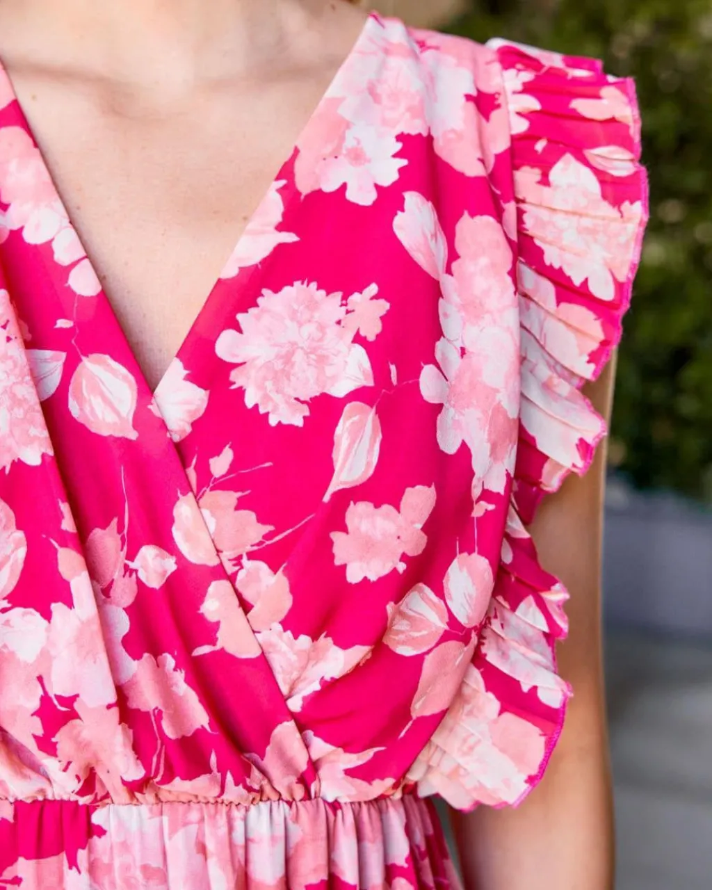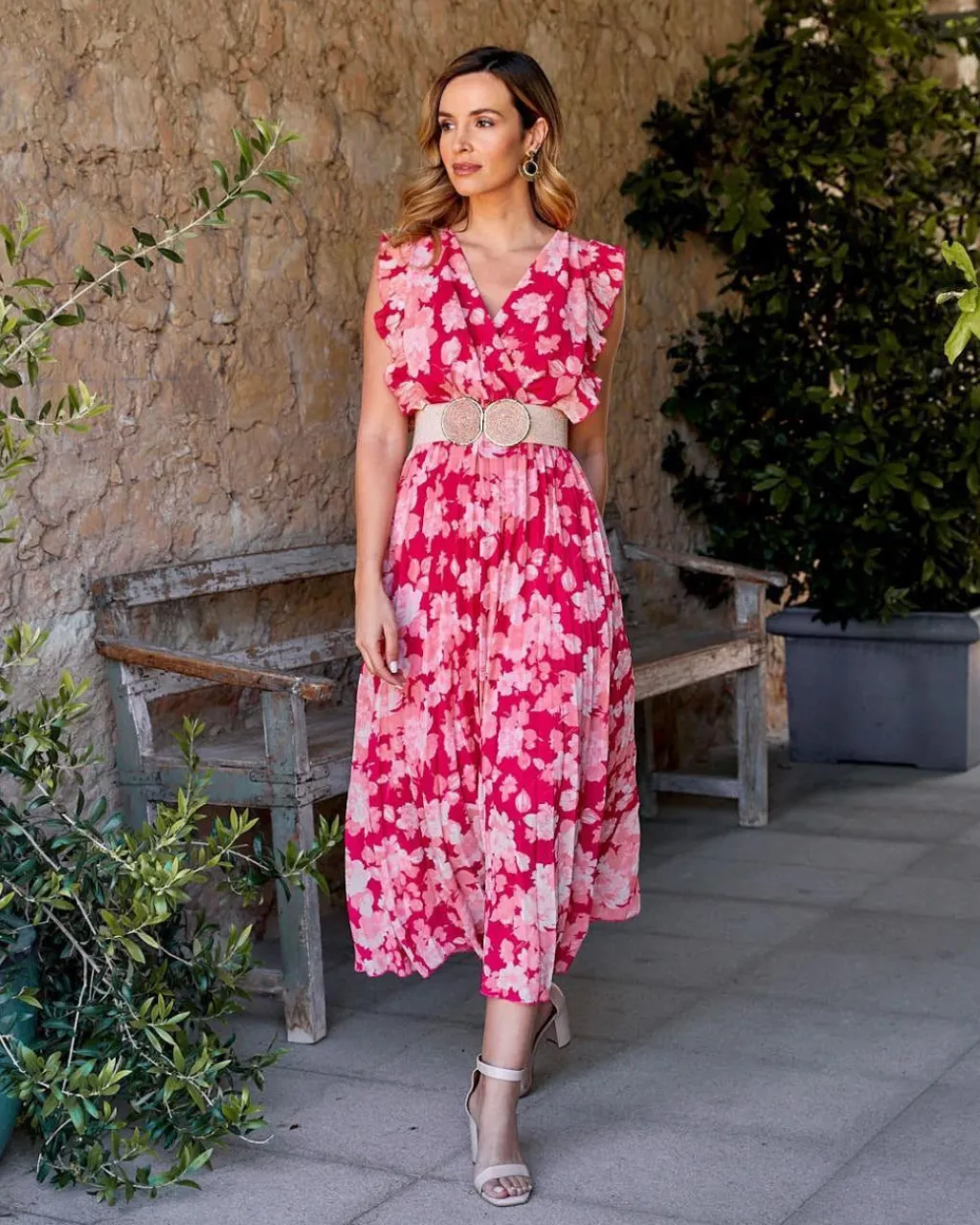 Vestido largo plisado con estampado floral en color frambuesa. Escote delantero en pico y cruzado. Corte en la cintura con elástico. Falda plisada. Vestido sin mangas con volante plisado en ambos hombros. Forro interior. Ideal para embarazos y lactancia.