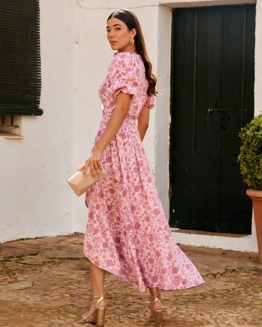 Vestido en tonos rosas con estampado floral. Escote en pico cruzado, se ata en el lateral. Cintura ligeramente ajustable por la cinta para atar. Manga corta abullonada. Bajo del vestido irregular. Un vestido ideal para las invitadas con un toque de color muy especial. Vestido también perfecto para el embarazo y la lactancia.