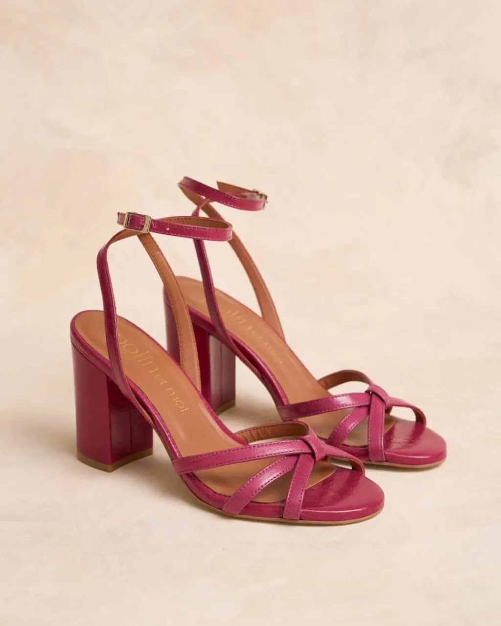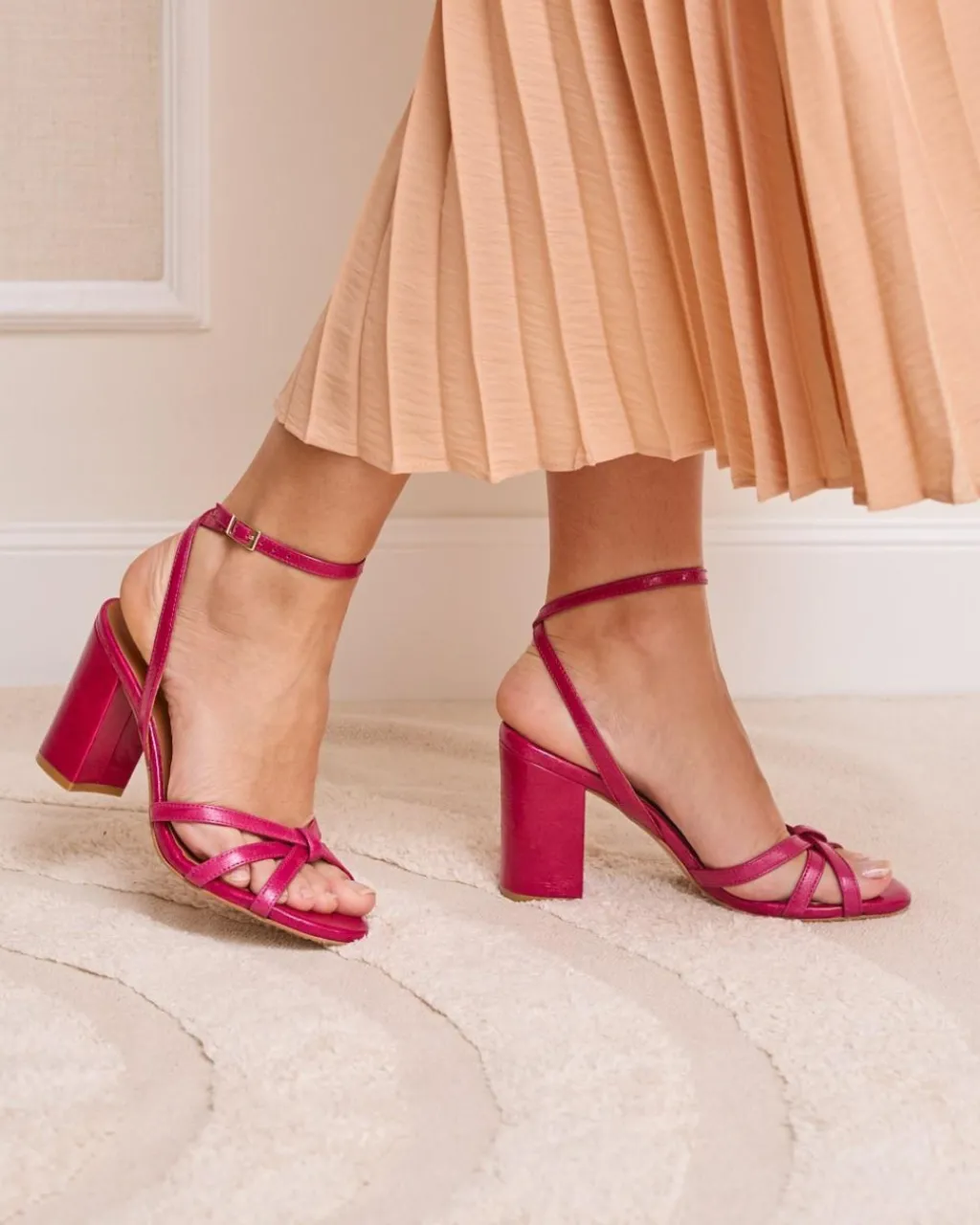 Sandalia de tacón destalonada en color buganvilla con varias cintas que se cruzan entre sí formando un nudo en el centro. Punta redondeada. Cierre al tobillo mediante correa regulable con hebilla cuadrada. Tacón ancho para mayor comodidad. Un zapato muy femenino y elegante para los eventos de esta temporada.