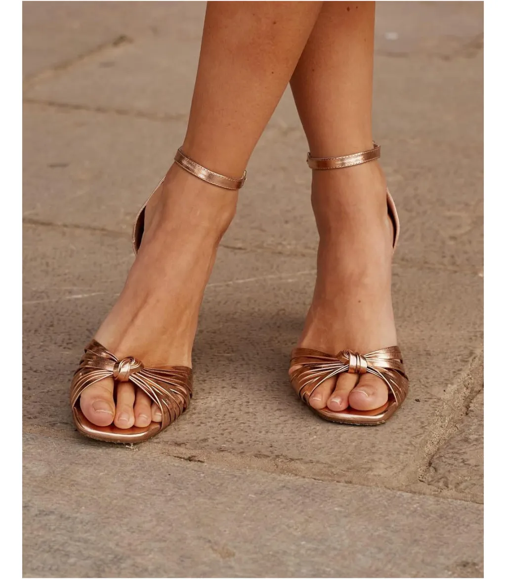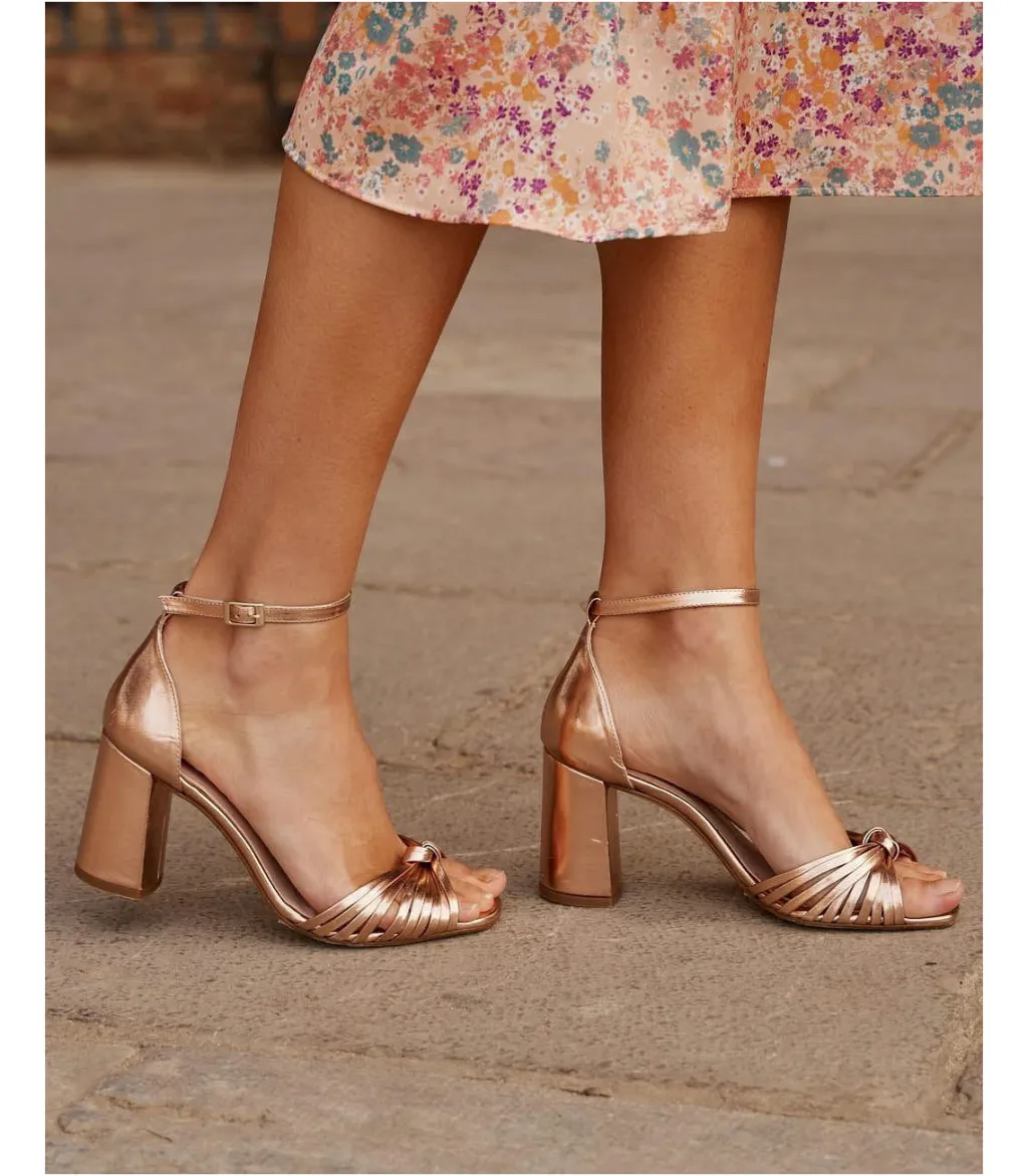 Sandalia de piel metalizada con tiras en el empeine y nudo en color maquillaje. Diseño de múltiples tiras al tono en el empeine con nudo en el centro. Punta ligeramente cuadrada. Cierre al tobillo mediante correa regulable con hebilla cuadrada. Tacón ancho para mayor comodidad. Un zapato muy femenino y elegante para los eventos de esta temporada.