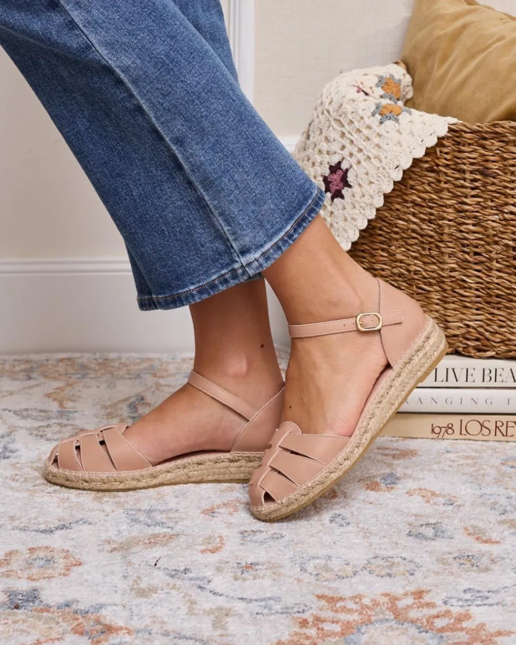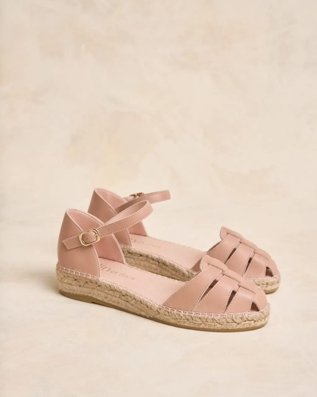 Sandalia de esparto ligeramente plana en tono nude. Puntera redondeada. Escote con múltiples tiras que deja entre ver el pie. Sujeción al empeine con finas tiras con hebilla. La plantilla tiene una almohadilla para mayor comodidad. Una sandalia cómoda, para elevar cualquier look esta temporada.