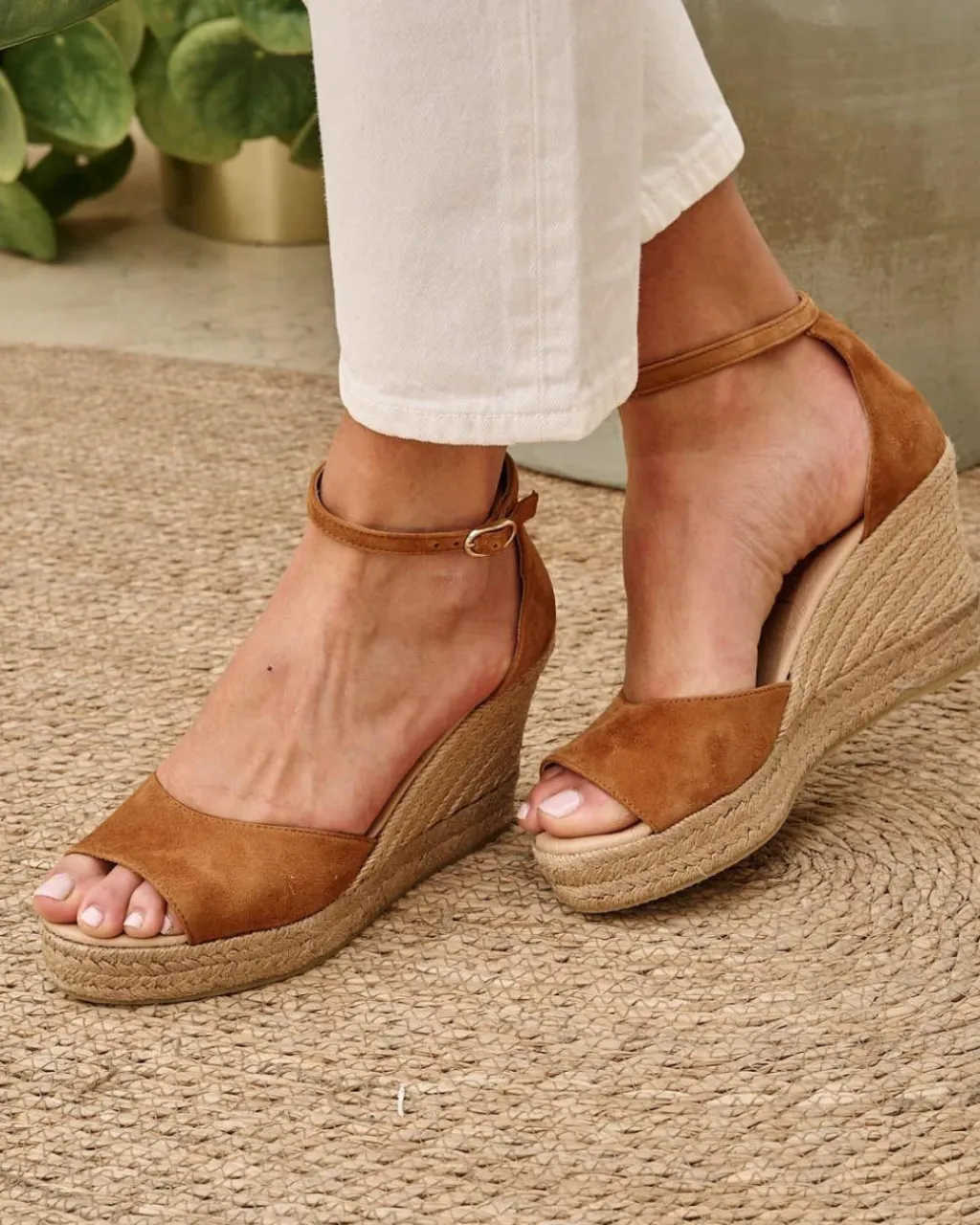 Sandalia en piel de serraje de color taupe. Escote redondeado. Talonera y tobillera de piel de serraje en color taupe con hebilla. Interior de piel. Fabricación española de yute natural. La plantilla tiene una almohadilla para mayor comodidad. Una sandalia perfecta para todo el día e ideal para combinar con tus prendas favoritas de esta temporada.