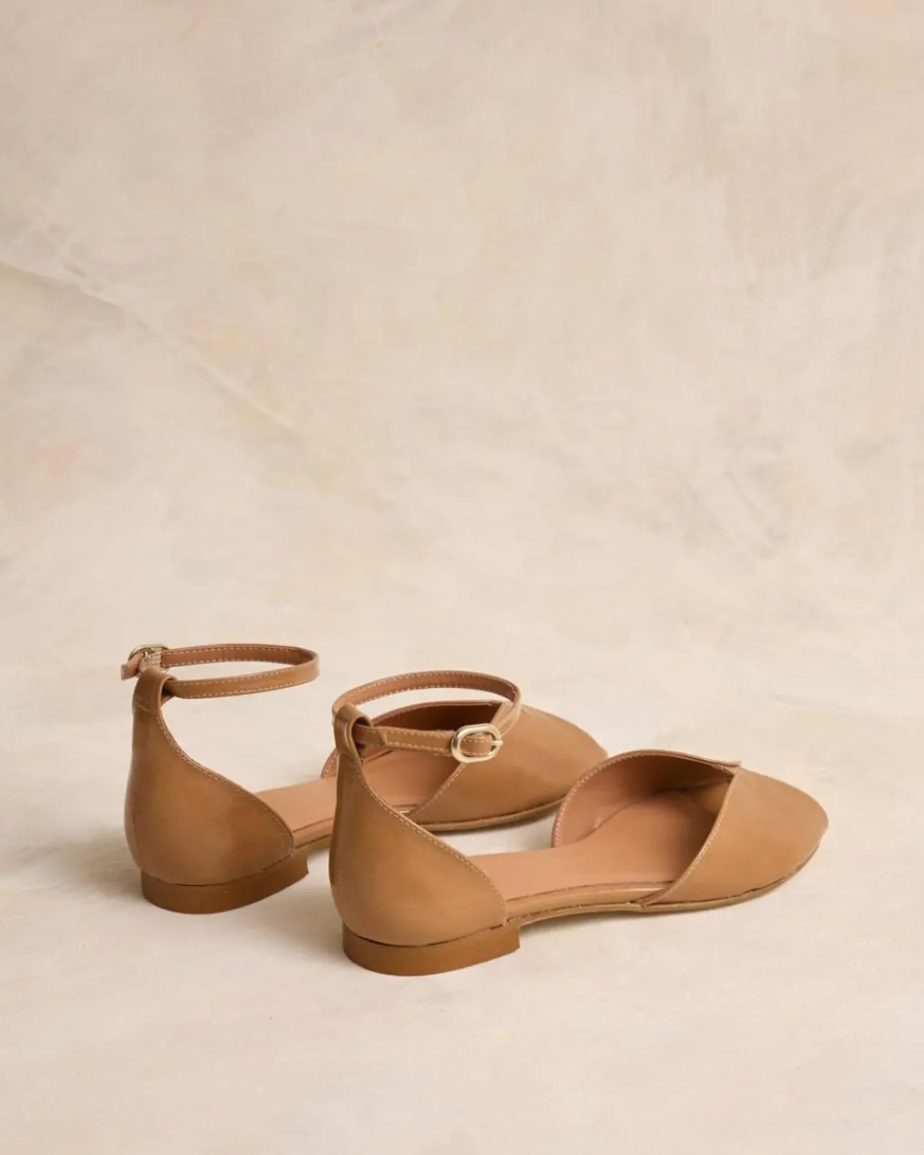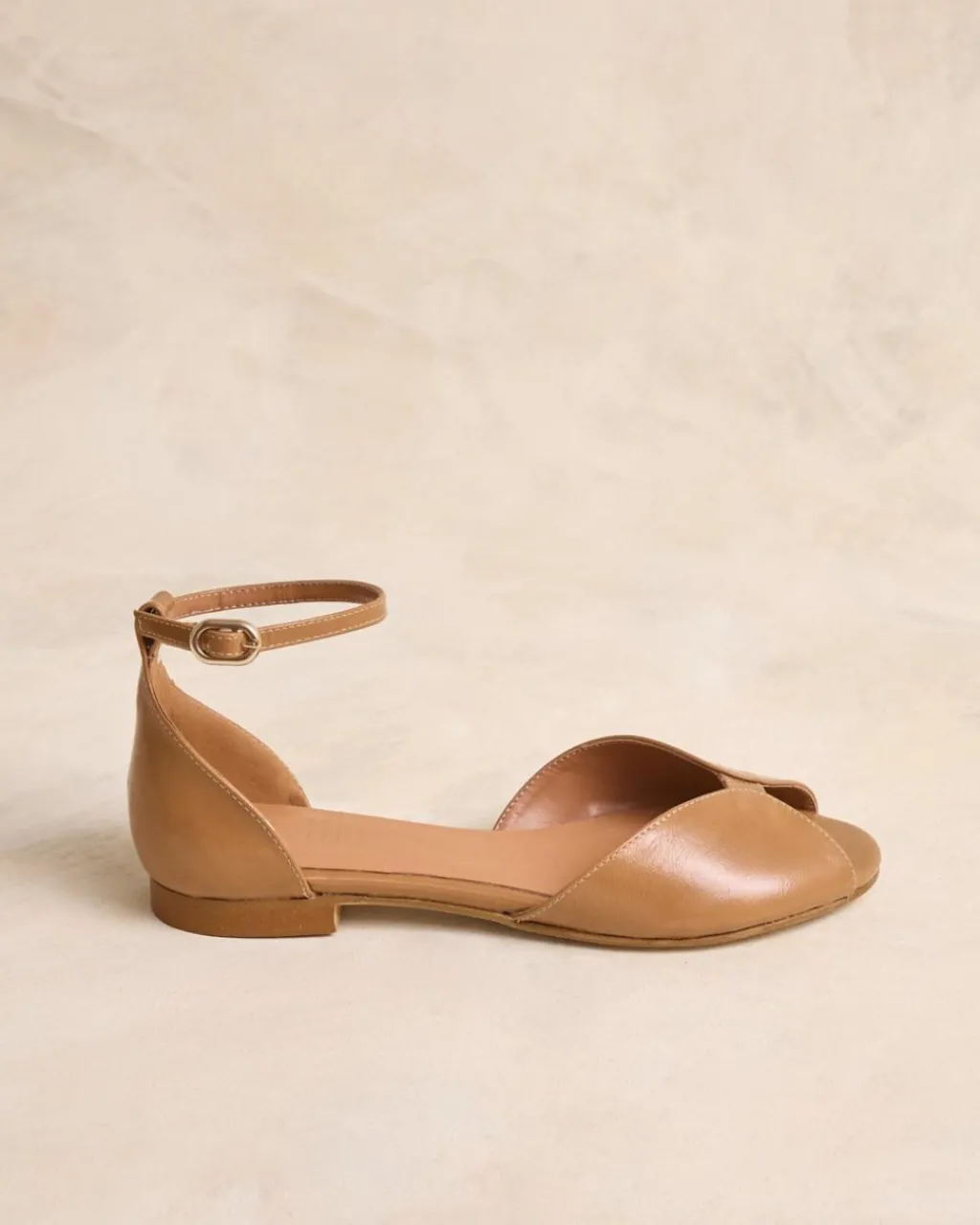 Sandalia de piel plana en color cuero. Puntera ligeramente redondeada y escote mariposa. Cierre al tobillo con tira en tono y hebilla para ajustar la sandalia al tobillo. Una sandalia elegante y cómoda.