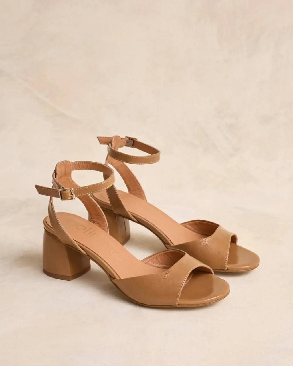 Sandalia de piel con tacón en tono cuero. Puntera abierta ligeramente redonda. Escote redondeado. Tacón cuadrado. Cierre al tobillo con tiras en tono y hebillas para ajustar la sandalia al tobillo. Una sandalia elegante y cómoda.