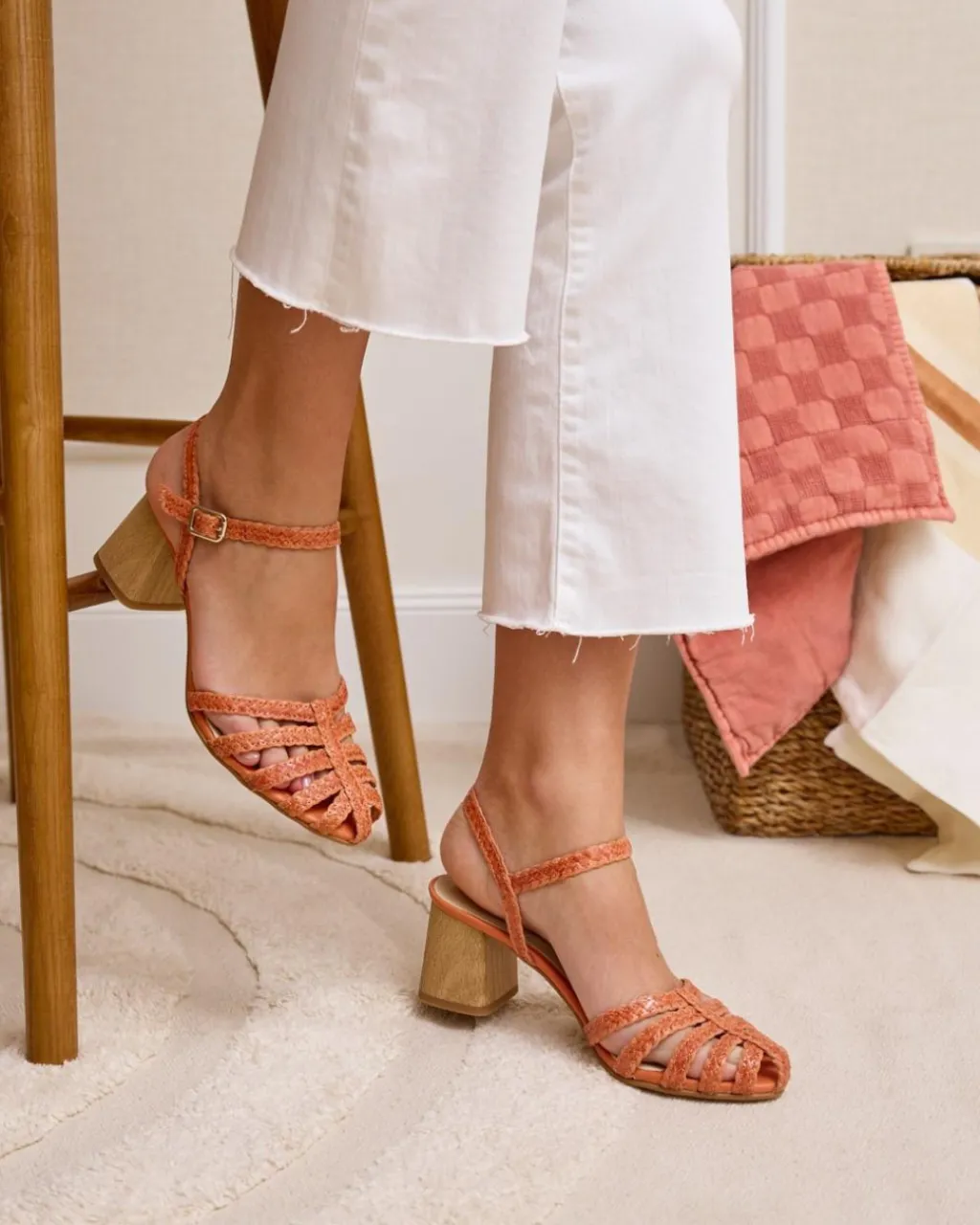 Sandalia trenzada de piel en color naranja. Puntera redondeada con detalle de cintas trenzadas cruzadas. Talón sujeto con cinta de piel. Tobillo con cita con hebilla para un mejor ajuste. Tacón cuadrado de madera. Una sandalia muy especial y estilosa para esta temporada.