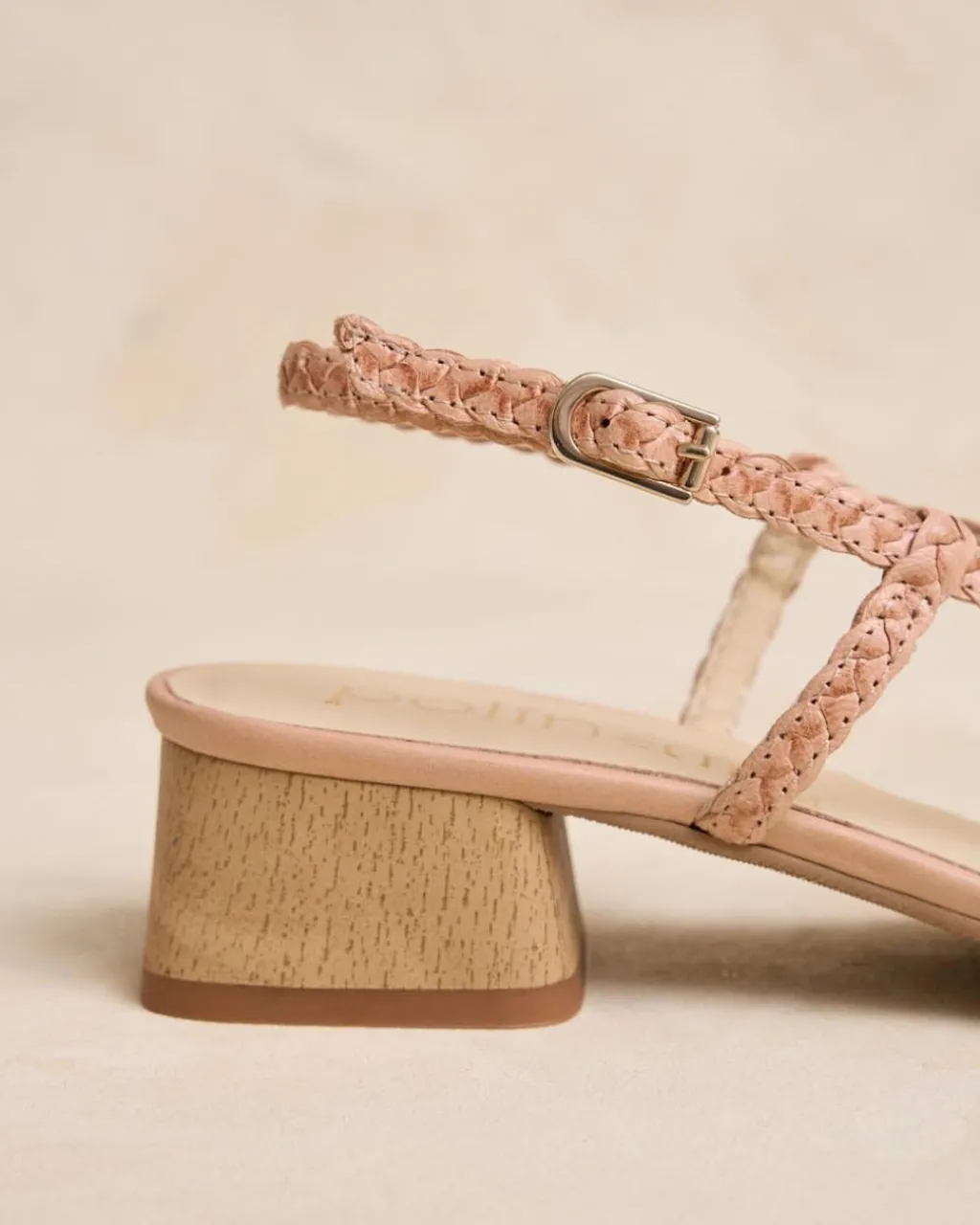 Sandalia con tacón trenzada de piel en color rosa. Empeine con triple cinta trenzada con detalle de nudo en el centro. Talón sujeto con cinta de piel con hebilla para un mejor ajuste. Pequeño tacón cuadrado con efecto madera. Una sandalia cómoda y muy versátil para el día a día.