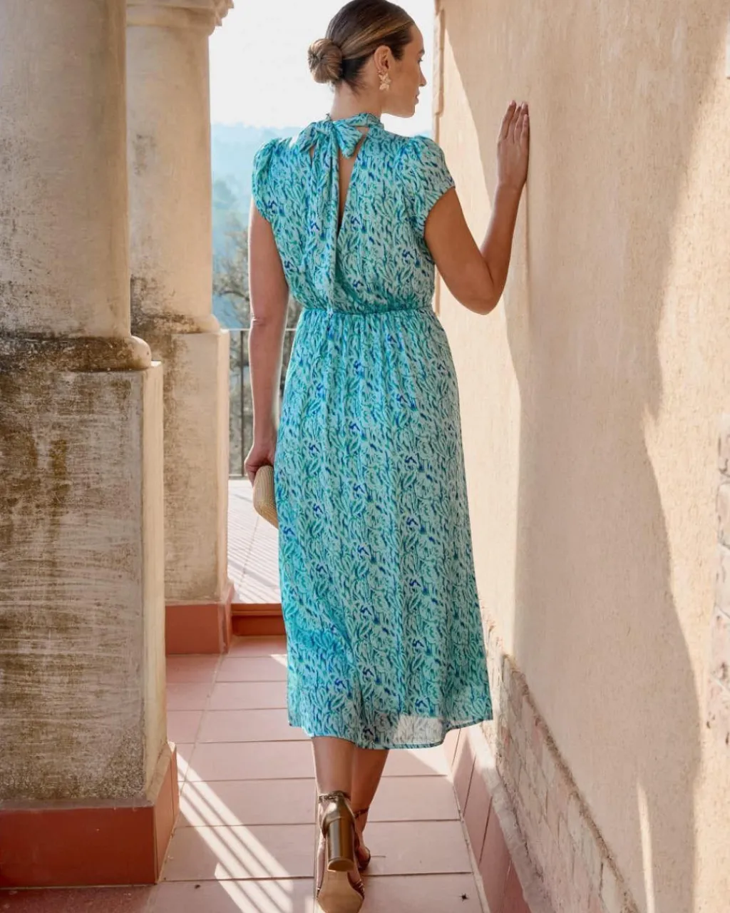 Vestido largo con estampado sobre fondo celeste. Escote cerrado con cuello subido con lazada trasera para atar. Pequeña apertura. Cuerpo recto y ajustado. Manga muy corta abullonada ¾. Falda ligera con pequeño vuelo.