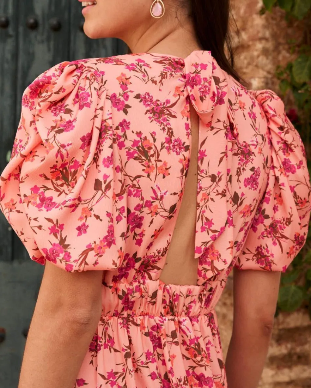 Vestido en tonos coral con estampado floral. Escote redondo, con lazada trasera en el cuello para atar y cerrar el vestido. Escote en la espalda. Cintura ligeramente más ajustada con goma para una mayor adaptación al cuerpo. Manga corta abullonada. Bajo del vestido fluido. Un vestido ideal para las invitadas con un toque de color muy especial.