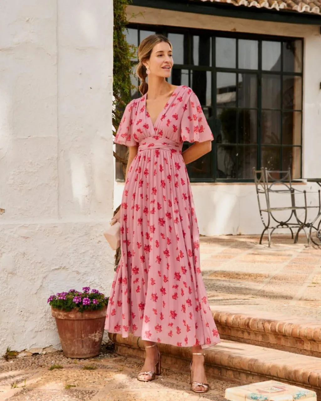 Vestido largo en tonos rosas, con estampado floral. Escote en pico, con drapeado debajo del pecho. Manga corta fluida. Cintura ligeramente más ajustada con goma para una mayor adaptación al cuerpo. Falda del vestido plisada, con bajo fluido. Un vestido ideal para las invitadas con un toque de color muy especial. Vestido también perfecto para el embarazo y la lactancia.
