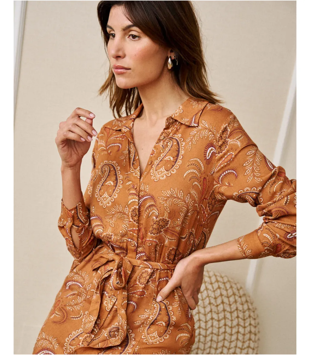 Vestido camisero midi con estampado en color teja. Vestido con cuello camisa. Modelo de manga larga terminada en puño, Vestido ajustado a la cintura mediante un cinturón del mismo tejido. Hilera de botones desde el cuello hasta el bajo. Falda midi con ligero vuelo. Vestido ideal para la lactancia y embarazo. El vestido con el que completar tu armario.Diseñado en España.