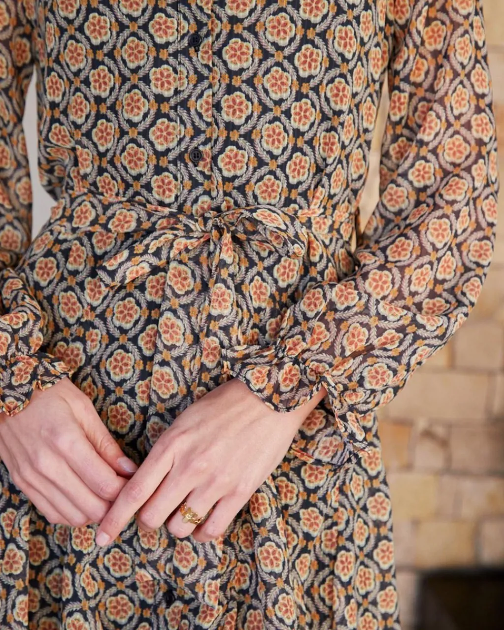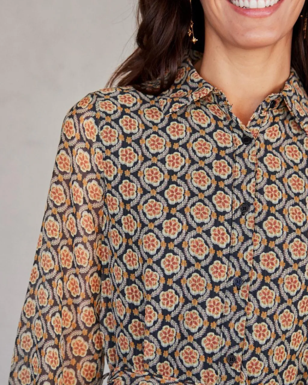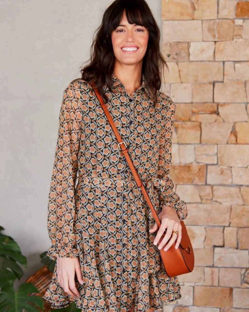 Vestido camisero corto con estampado geométrico en color ocre. Cuello camisa. Modelo de manga larga terminado en puño. Hilera de botones desde el cuello hasta el bajo. Dispone de forro interior. Falda corta y con volumen.