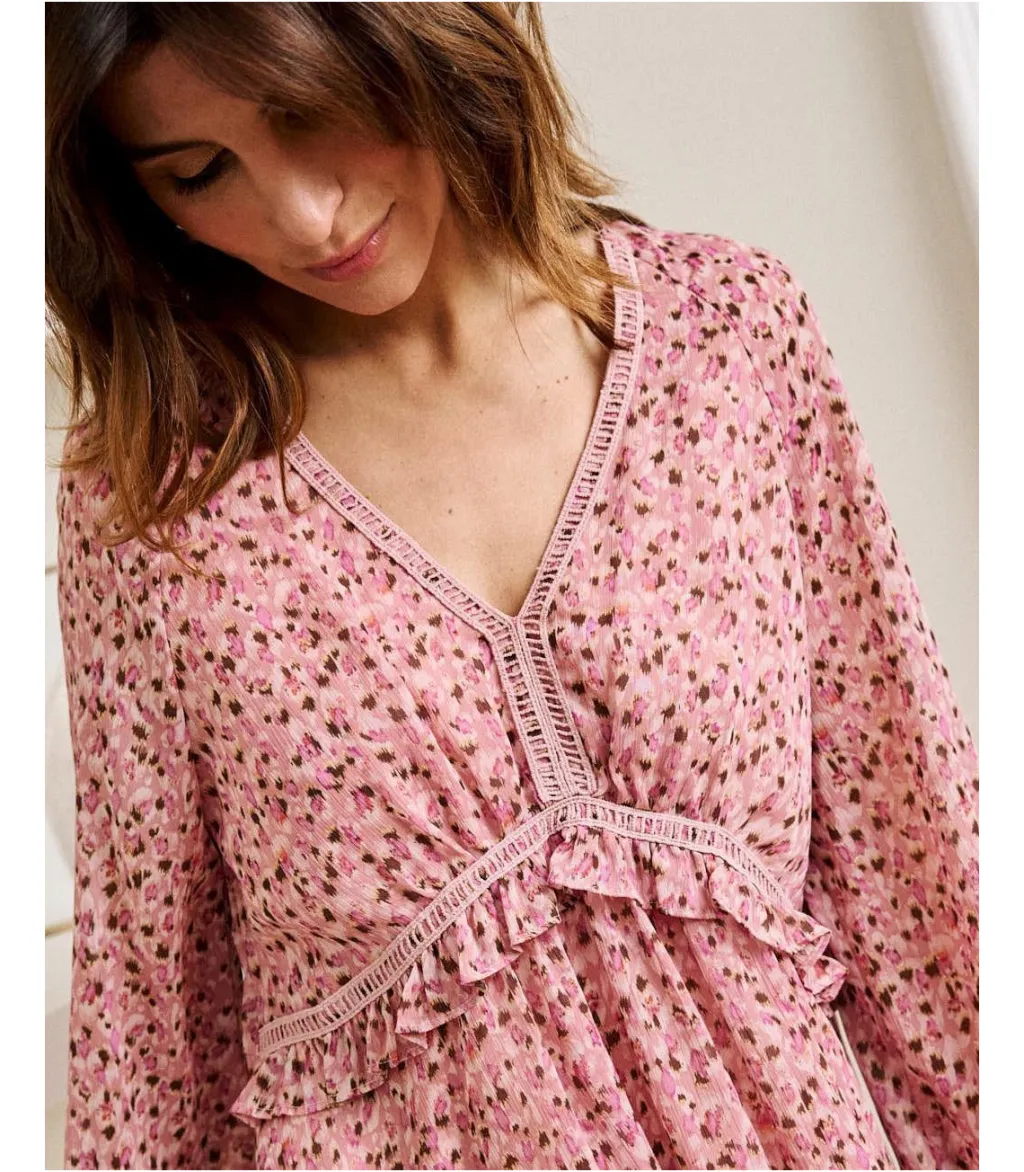 Vestido con corte babydoll corto con estampado floral en color rosa. Escote en pico con ribete. Modelo de manga larga terminado en Elástico. Corte con un pequeño volante bajo el pecho y elástico en la parte trasera de la cintura. Dispone de forro interior. Falda corta y con vuelo.