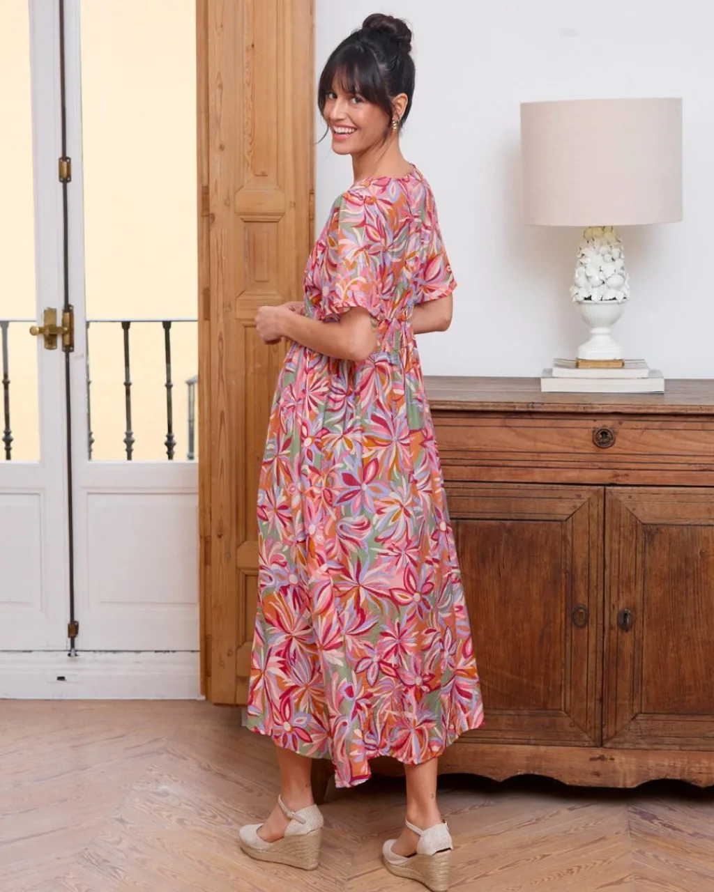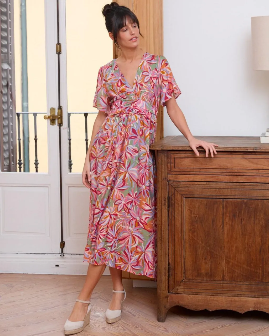 Vestido largo con estampado floral sobre un fondo en tono rosa. Vestido con escote en pico y corte con drapeado bajo el pecho. Modelo con manga corta fluida. Falda larga fluida. Vestido ideal para la lactancia y primeros meses de embarazo. Ver másVer menos Referencia 180130 COMPOSICIÓN Y MEDIDAS:70% Viscosa, 30% PoliamidaBego mide 1,80 cm y lleva la talla S. Si dudas con la talla te recomendamos usar el recomendador online.CUIDADOS:Lavar a mano máximo 30º Ficha técnica Colores ROSAS Etiquetas: SEA 14R506 – ENVÍOS, CAMBIOS Y DEVOLUCIONES Favorito58 ENVÍOS:Todos los envíos cuentan con gastos de envío, que dependen de la dirección de entrega.• Península y Portugal: 3,50€ | 2-4 días laborables.• Baleares: 6,50€ | Hasta 7 días laborables.• Países de la Unión Europea: 10,95€ | Hasta 10 días laborables.• Envíos a Europa (No UE): 15,95€ | Hasta 10 días laborables.• Resto del mundo*: Aprox 10€ | Hasta 15 días laborables.*NO hacemos envíos a Canarias, Ceuta, Melilla, Afganistán, Bielorusia, Congo, Bali, Myanmar, Nigeria, Rusia, Senegal, Somalia y Ucrania.¡Importante! En periodo de rebajas, los pedidos pueden tardar un poco más de lo habitual ¡Rogamos paciencia!CAMBIOS: ¡El envío con el cambio solicitado es gratuito!Pedidos realizados desde España:Plazo de 14 días laborables desde que recibes el paquete en casa.Pedidos realizados desde fuera de España:Plazo de 20 días naturales desde que realizamos el envío.*La gestión del envío del paquete de vuelta a nuestro almacén corre a cuenta del cliente, haciéndose cargo de los costes de este envío, mediante el courier de su elección o con nuestro servicio de DHL.En el primer trámite de cambio, el envío de vuelta es gratuito (tanto de talla como de producto). Permitimos DOS trámites de cambio, en caso de querer tramitar un segundo cambio, se descontarán los gastos de envío según destino.Una vez recibido el paquete en nuestro almacén, tramitaremos tu cambio en un plazo máximo de hasta 10 días laborables. Recibirás un correo de confirmación cuando este pedido de cambio esté listo para ser enviado.
