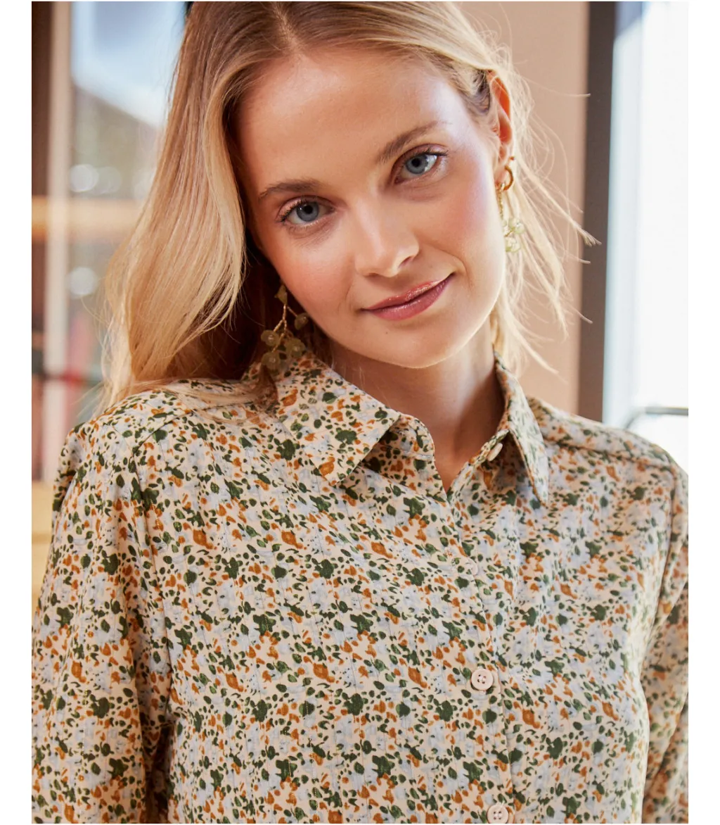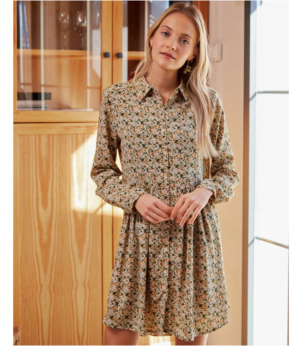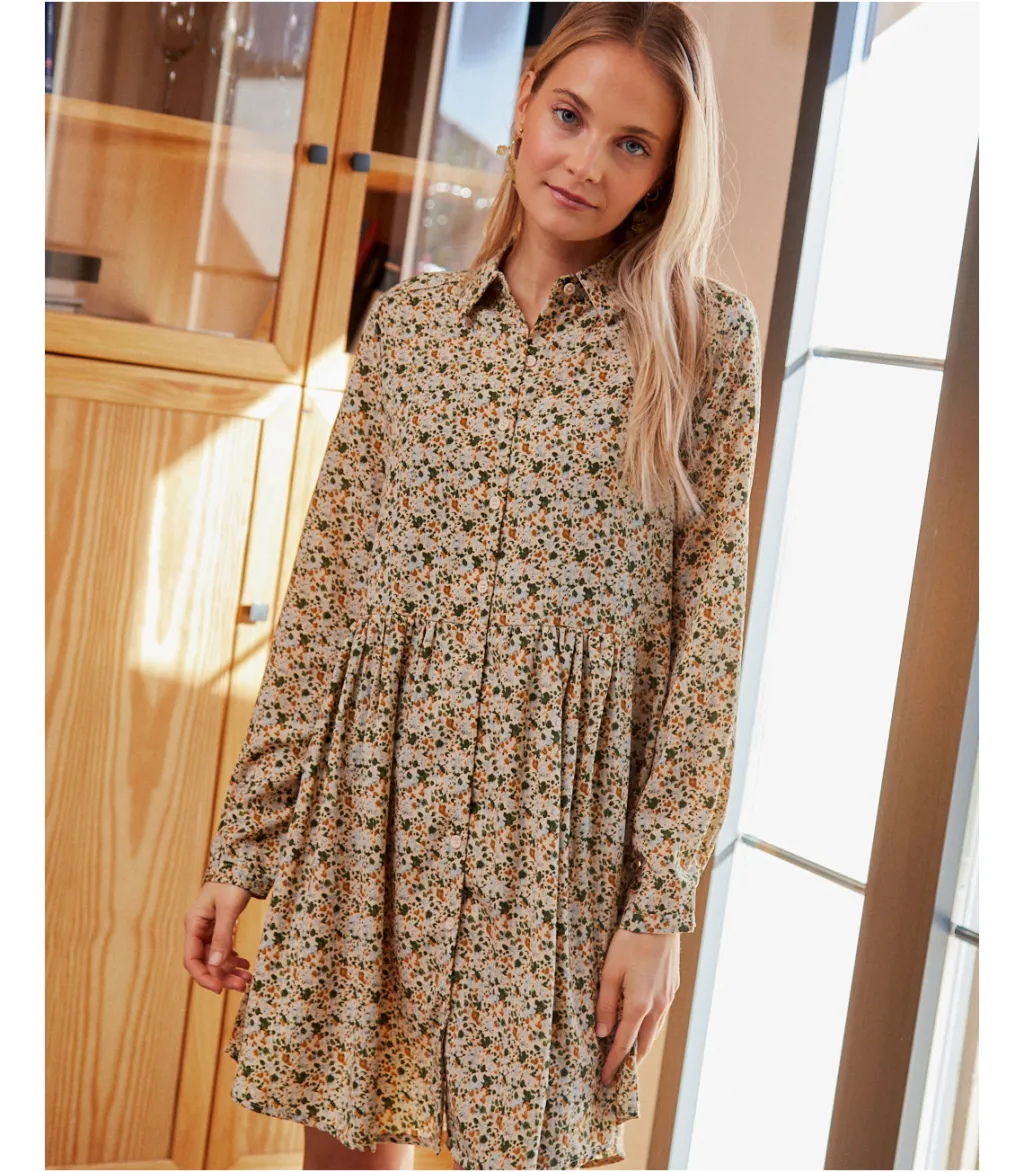 Vestido corto, estilo babydoll, con estampados en color oliva. Cuello de camisa e hilera de botones desde el cuello a la cintura. Prenda holgada, con corte en la cintura y finas líneas de lúrex. Diseño de manga larga. Falda corta con un ligero vuelo. Modelo ideal para el embarazo y la lactancia. Un vestido cómodo y alegre con el que disfrutar del día completo, de la mañana a la noche.