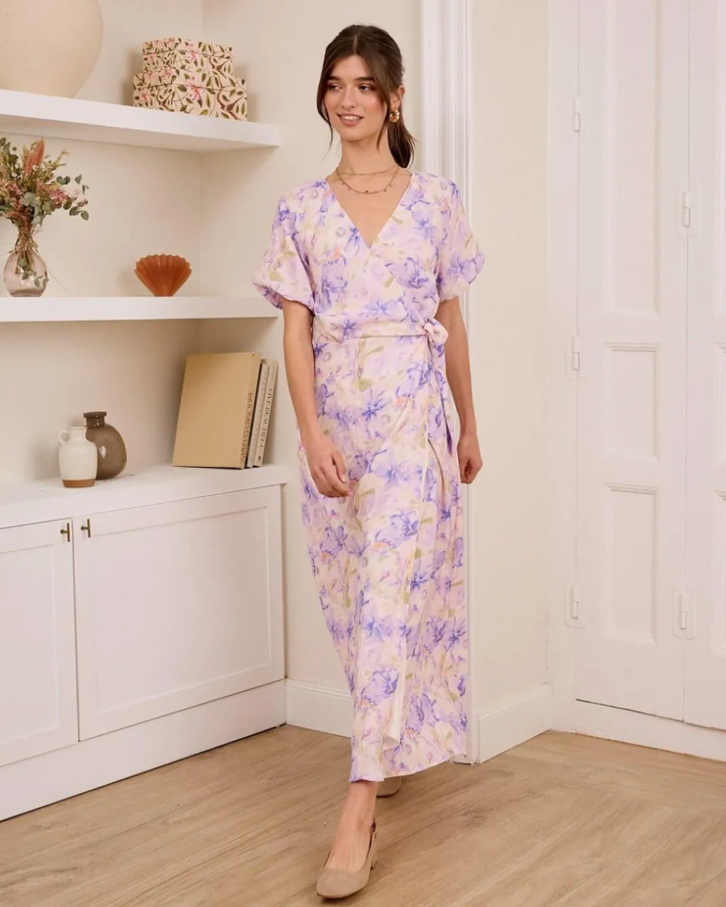 Vestido largo cruzado, que se ata con lazada lateral. Modelo con estampado floral en tonos lila. Vestido con escote en pico. Manga corta abombonada. Falda larga con apertura lateral y ligero vuelo. Vestido ideal para la lactancia y primeros meses de embarazo.