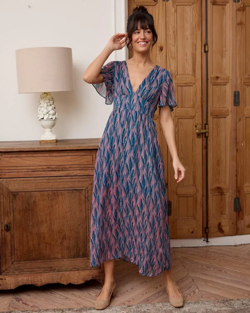 Vestido largo con estampado floral sobre un fondo en color petróleo. Vestido con escote en pico y corte bajo el pecho. Elástico a la cintura en la parte trasera. Manga corta estilo murciélago con ligero vuelo. Falda larga y ligero vuelo. Vestido ideal para la lactancia y primeros meses de embarazo. Ver másVer menos Referencia 179971 COMPOSICIÓN Y MEDIDAS: