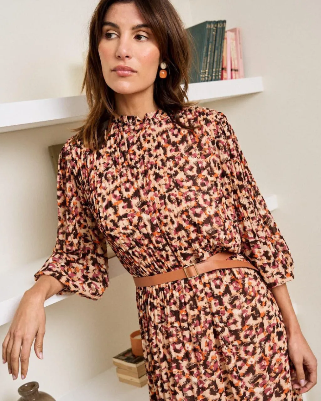 Vestido plisado de largura midi con estampado floral sobre un fondo en color beige. Cuello redondo con pequeño volante. Modelo de manga larga terminado en elástico. Dispone de forro interior. Falda midi con vuelo.