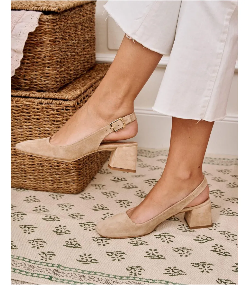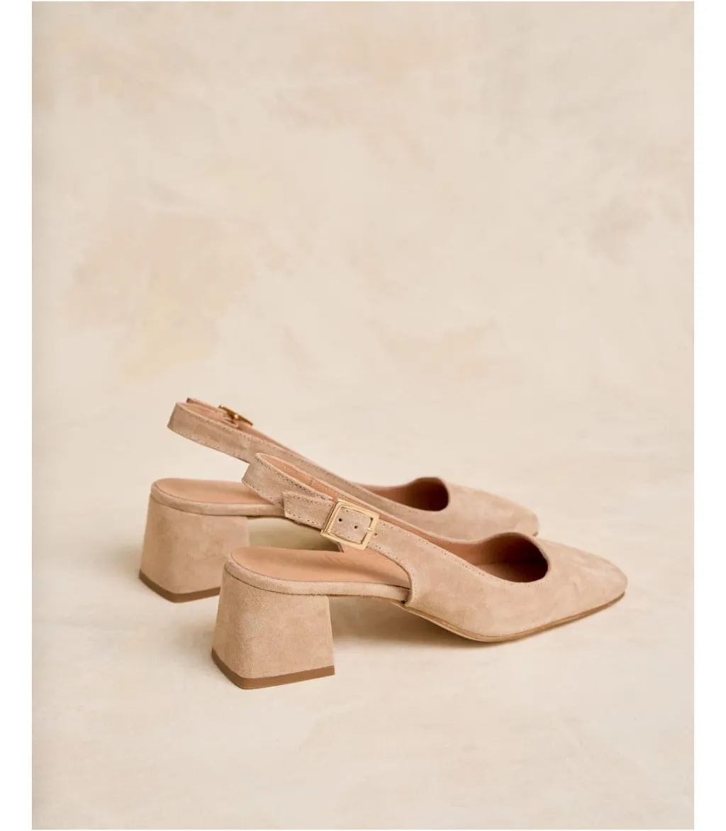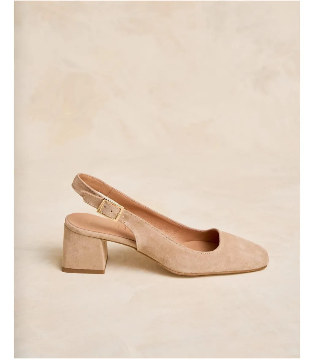 Bailarina de ante destalonada en color arena. Puntera cuadrada. Correa al talón con hebilla. Pequeño tacón cuadrado. Es un calzado diferente y cómodo para combinarlo tanto con pantalones como con vestidos.