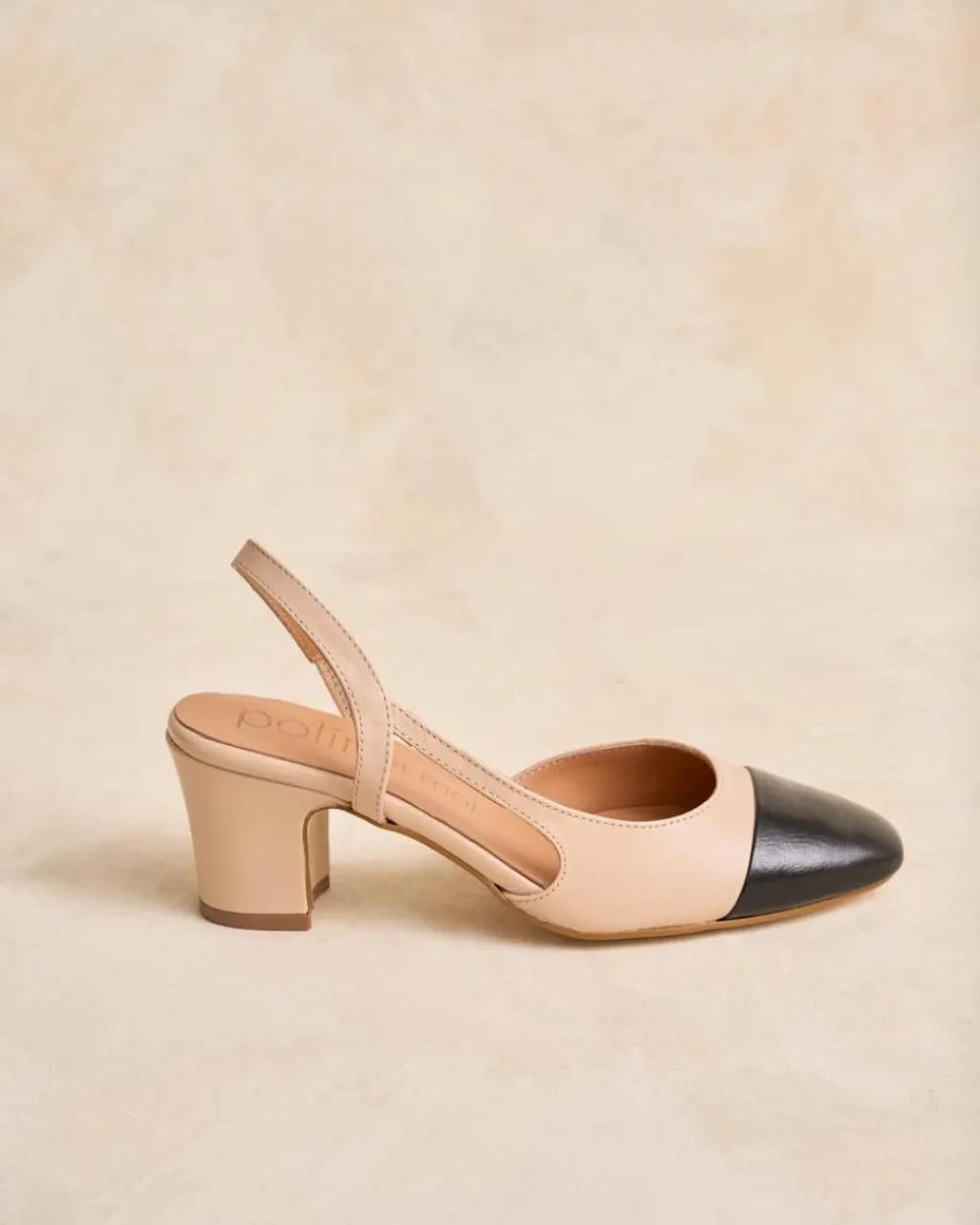 Bailarina de piel con tacón y bicolor: negro y nude. Zapato destalonado. Punta ligeramente cuadrada en otro color. Escote redondeado. En la puntera tiene un corte diagonal. Un zapato elegante y cómodo.