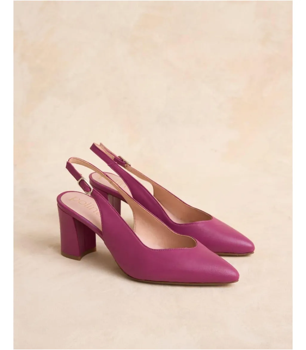 Zapato de piel destalonada en color buganvilla. Puntera puntiaguda. Correa con elástico al talón. Tacón cuadrado. Es un calzado diferente y cómodo para combinarlo tanto con pantalones como con vestidos.