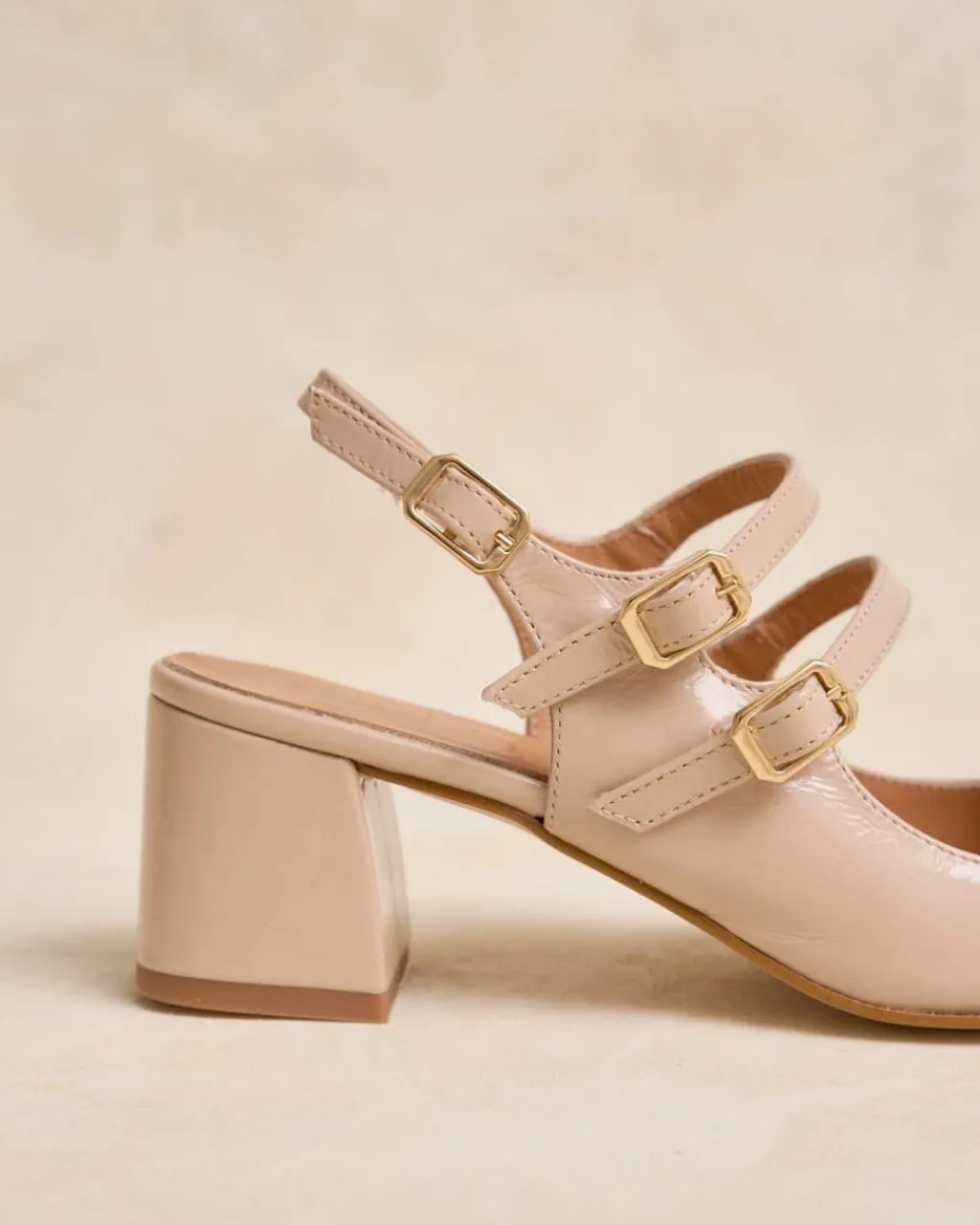 Zapato de tacón en color beige. Punta picuda ligeramente redonda. Escote redondeado. Cierre en el empeine mediante dos correas regulables con hebilla cuadrada y otra en el talón. Tacón ancho para mayor comodidad. Un zapato muy femenino y elegante para los eventos de esta temporada.
