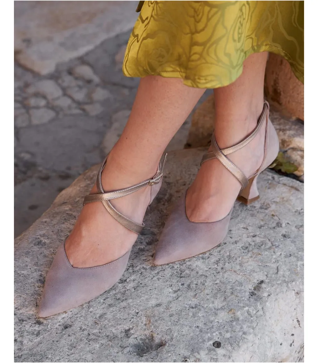 Mary Jane de ante en color taupe para tus eventos de esta temporada. Puntera cerrada ligeramente pronunciada y escote corazón. Detalle de cintas de piel metalizada cruzadas en el empeine que contrasta ligeramente con el ante. Cierre al tobillo mediante correa regulable con hebilla cuadrada. Tacón bajo y cuadrado con acabado en el mismo tono que el resto del zapato. Un zapato muy femenino y cómodo.